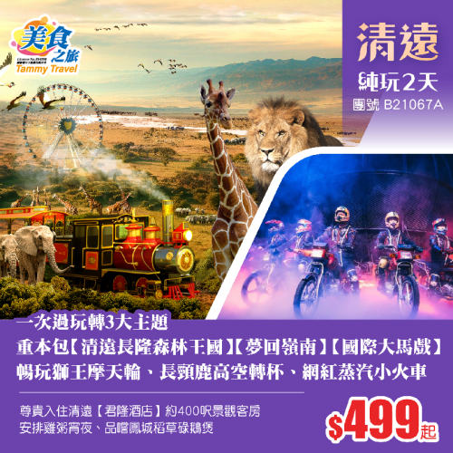 【親子樂園】一次過玩轉3大主題·重本包【清遠長隆森林王國】+【夢回嶺南】+【國際大馬戲】、暢玩獅王摩天輪·長頸鹿高空轉杯·乘坐網紅蒸汽小火車、貼心安排雞粥宵夜 純玩2天