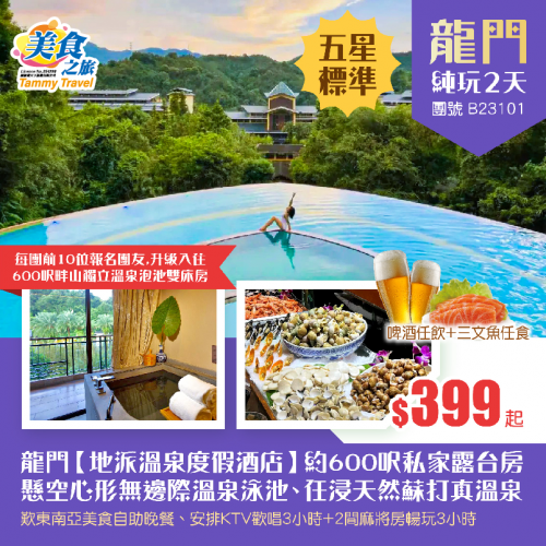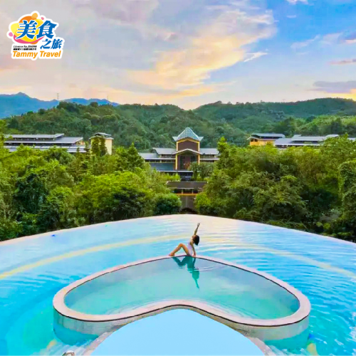 “天然氧吧”五星標準【龍門地派溫泉度假酒店】約600呎私家露台房、歎酒店東南亞美食自助晚餐、暢玩懸空心形無邊際溫泉泳池、任浸50多個天然蘇打真溫泉泡池、KTV歡唱3小時+麻將暢玩3小時 純玩2天