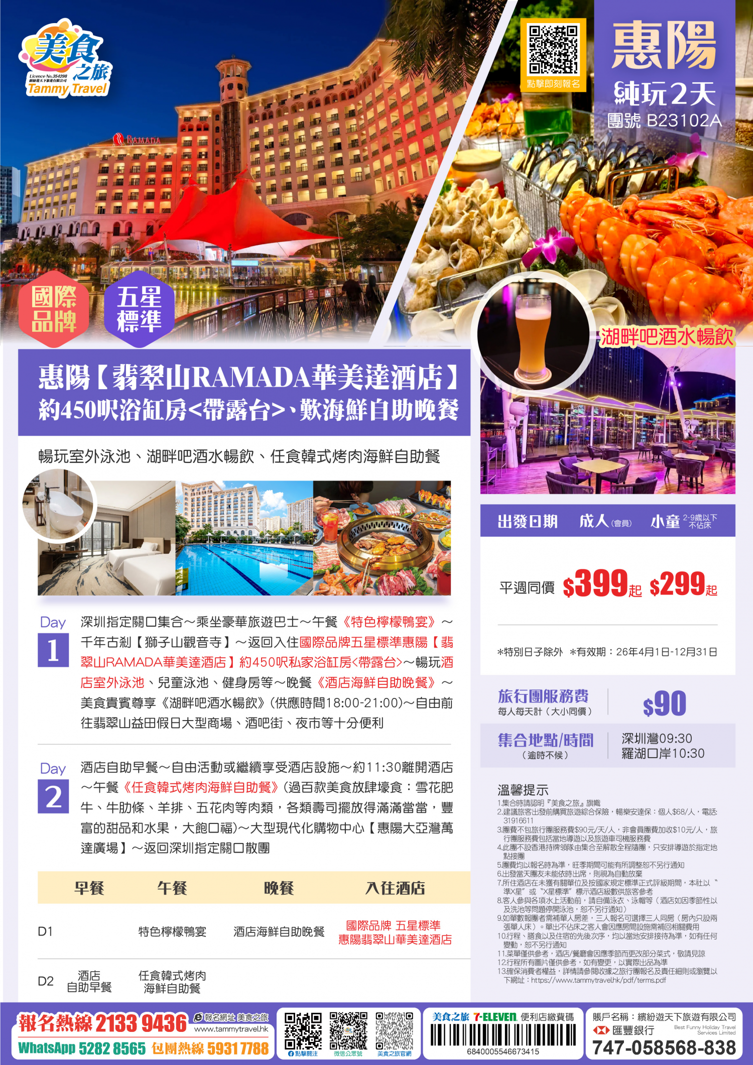 國際品牌五星標準惠陽【翡翠山RAMADA華美達酒店】約450呎浴缸房<帶露台>、歎酒店海鮮自助晚餐、尊享湖畔吧酒水暢飲、暢玩室外泳池、任食韓式烤肉海鮮自助餐、品特色檸檬鴨宴 純玩2天