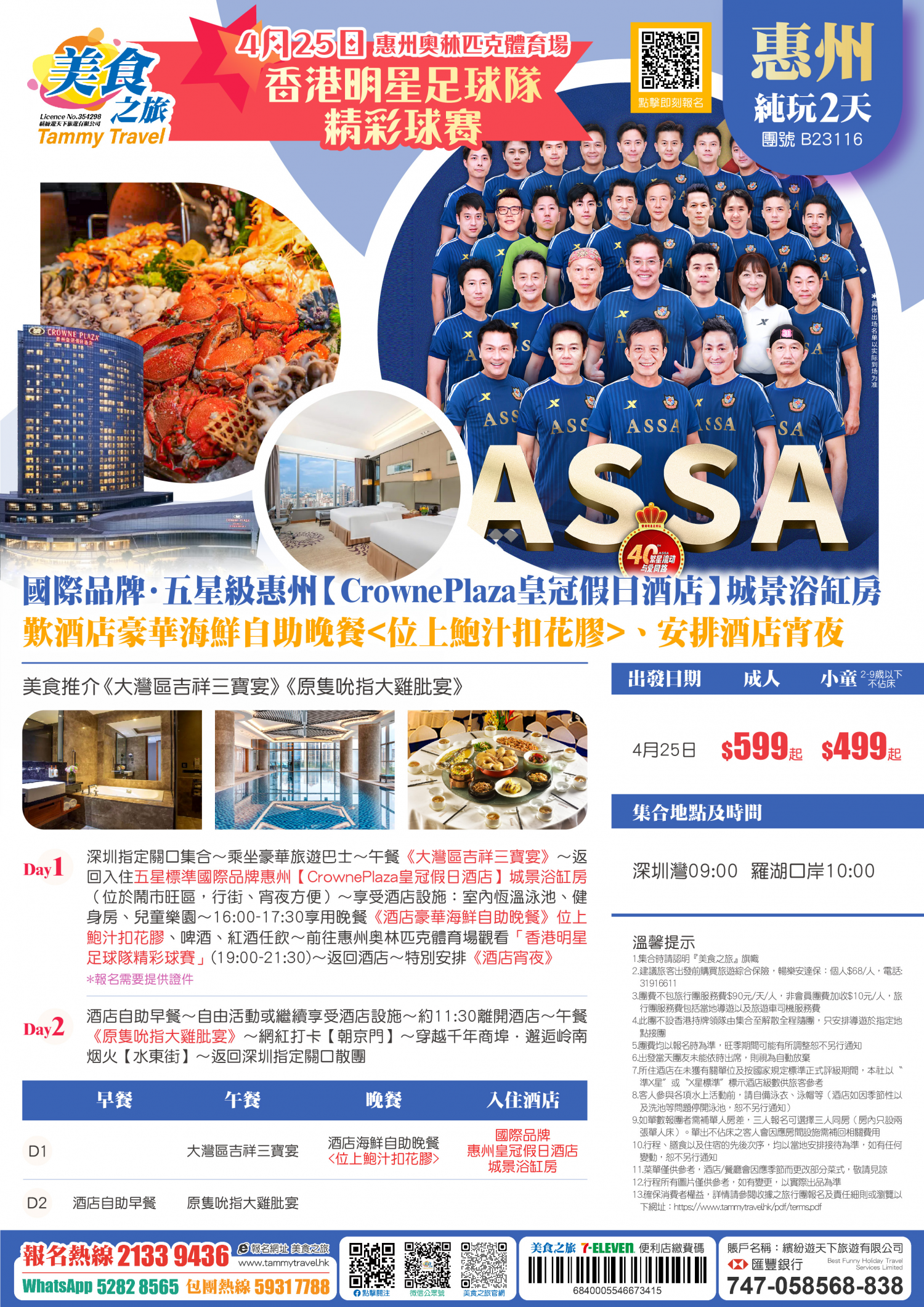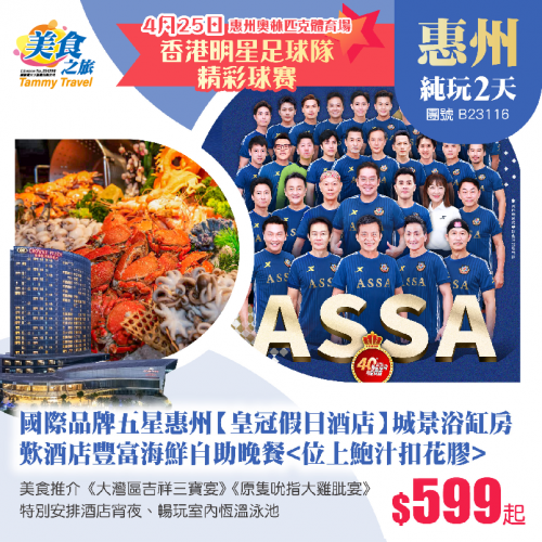 「4.25香港明星足球隊精彩球賽」國際品牌五星級【惠州皇冠假日酒店】城景浴缸房、歎酒店豪華海鮮自助晚餐<位上鮑汁扣花膠>、暢玩室內恆溫泳池、美食推介《大灣區吉祥三寶宴》《原隻吮指大雞肶宴》純玩3天
