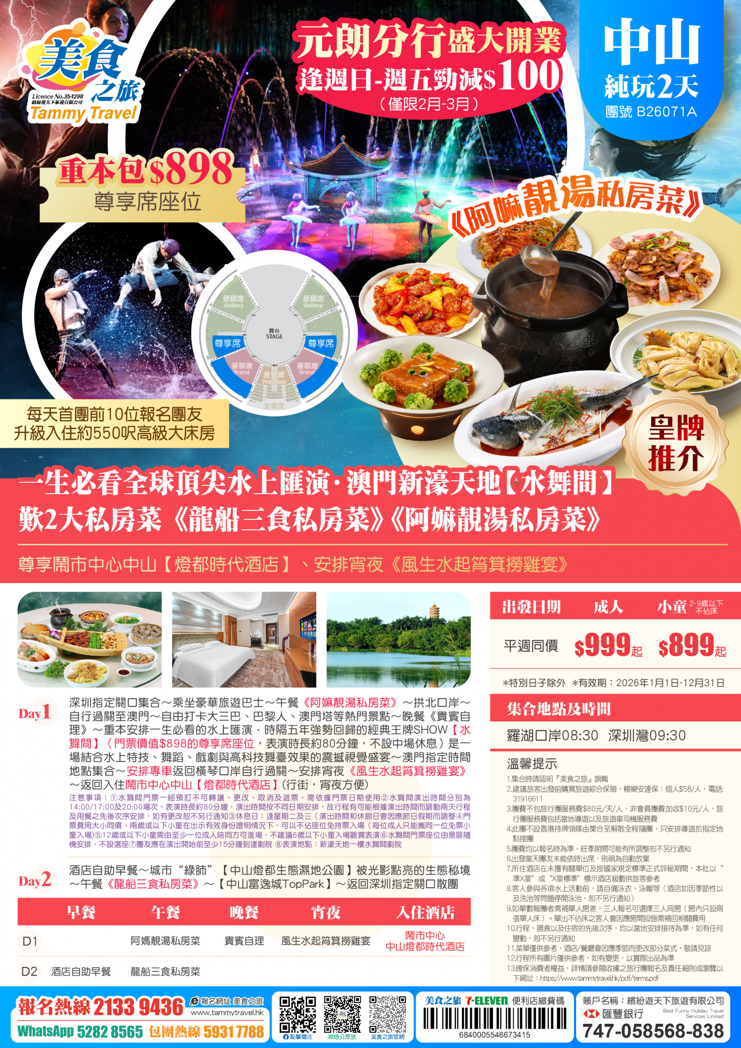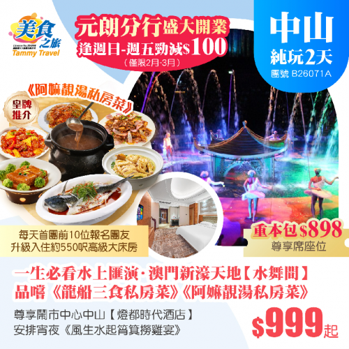 【重本包尊享席價值$898的門票】一生必看全球頂尖水上匯演「水舞間」、品嚐《龍船三食私房菜》《阿嫲靚湯私房菜》、宵夜《風生水起筲箕撈雞宴》、尊享鬧市中心【中山燈都時代酒店】純玩2天