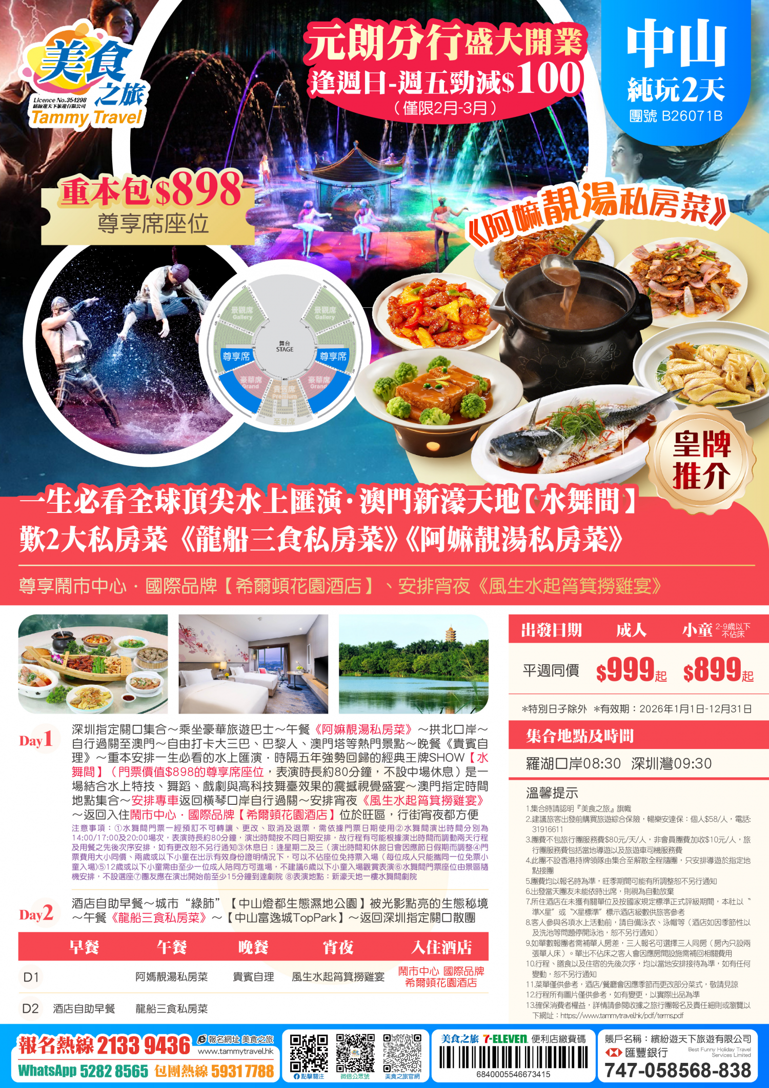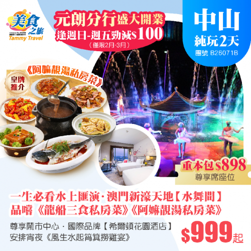 【重本包尊享席價值$898的門票】一生必看全球頂尖水上匯演「水舞間」、品嚐《龍船三食私房菜》《阿嫲靚湯私房菜》、宵夜《風生水起筲箕撈雞宴》、鬧市中心·國際品牌【中山希爾頓花園酒店】純玩2天