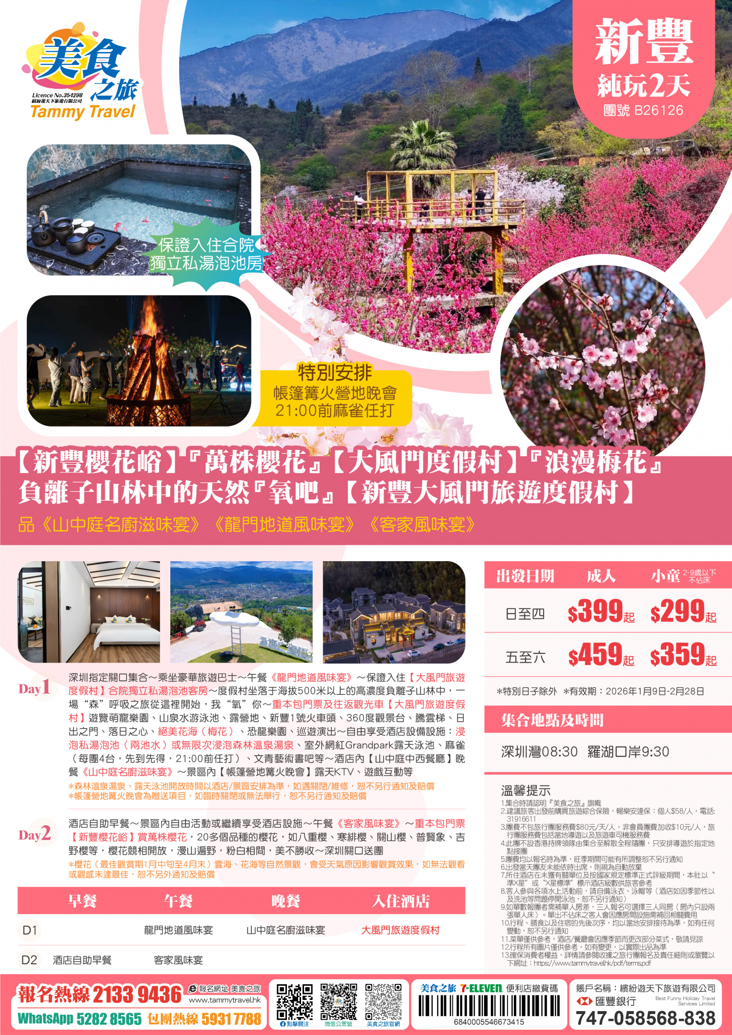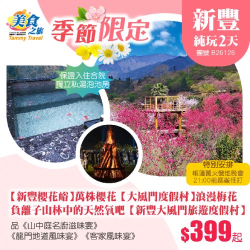 【季節限定】【新豐櫻花峪】『萬株櫻花』、【大風門度假村】『浪漫梅花』、 負離子山林中的天然『氧吧』【新豐大風門旅遊度假村】 、品《山中庭特色宴》《龍門地道風味宴》《客家風味宴》 純玩2天