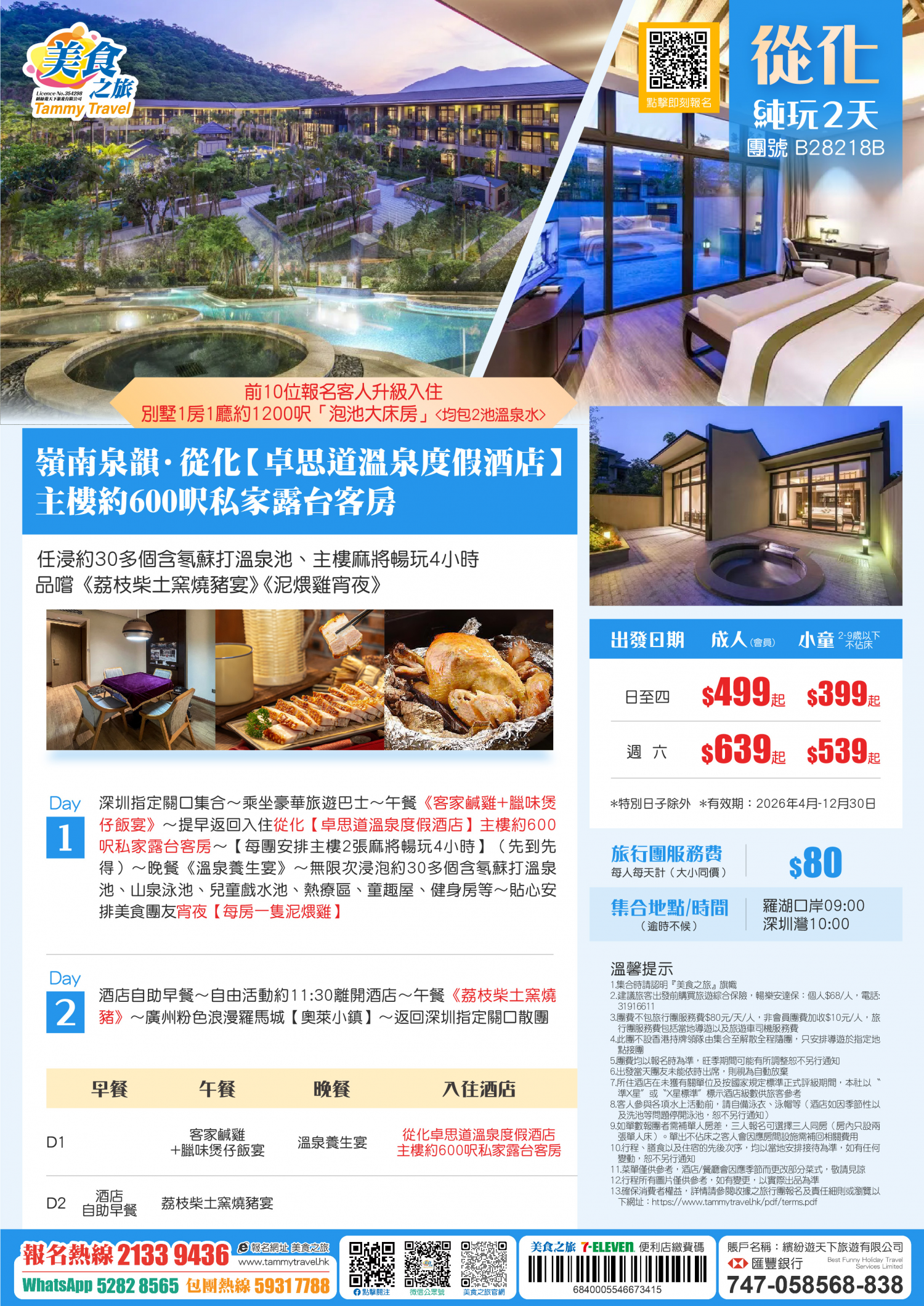 嶺南泉韻·從化【卓思道溫泉度假酒店】主樓約600呎私家露台客房、 任浸約30多個含氡蘇打溫泉池、主樓麻將暢玩4小時、品嚐《荔枝柴土窯燒大豬宴》《客家鹹雞+臘味煲仔飯宴》《泥煨雞宵夜》純玩2天