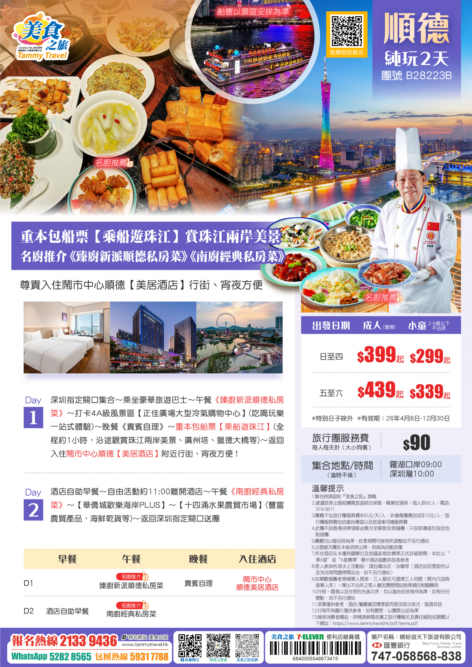 重本包船票【乘船遊珠江】賞珠江兩岸美景、名廚推介《臻廚新派順德私房菜》《南廚經典私房菜》、入住鬧市中心順德【美居酒店】行街、宵夜方便 純玩2天