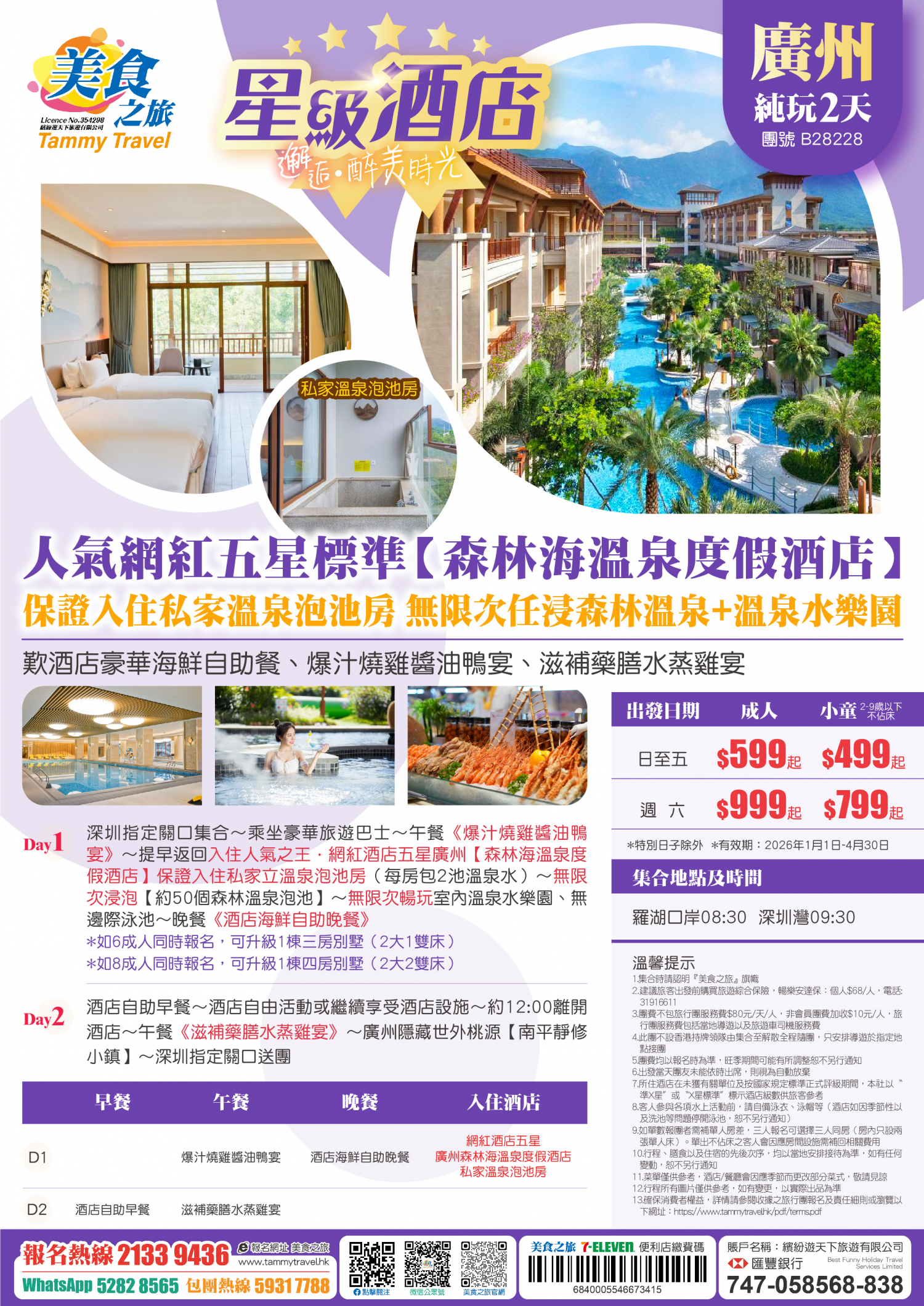 【星級酒店】人氣網紅五星標準【森林海溫泉度假酒店】保證入住私家溫泉泡池房、無限次任浸森林溫泉+溫泉水樂園、豪歎《酒店豪華海鮮自助餐》純玩2天