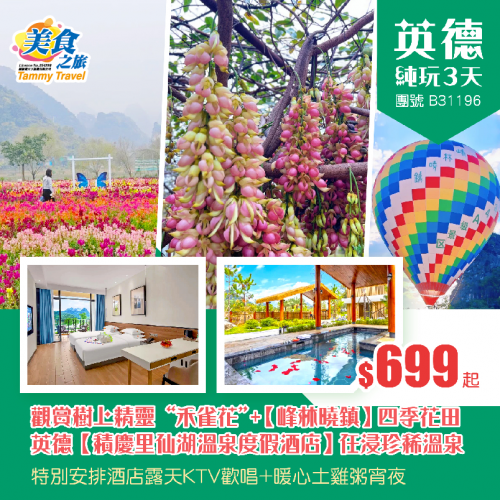 觀賞樹上精靈“禾雀花”+峰林曉鎮四季花田、入住英德【積慶里仙湖溫泉度假酒店】任浸珍稀溫泉、特別安排酒店露天KTV歡唱+暖心土雞粥宵夜純玩3天