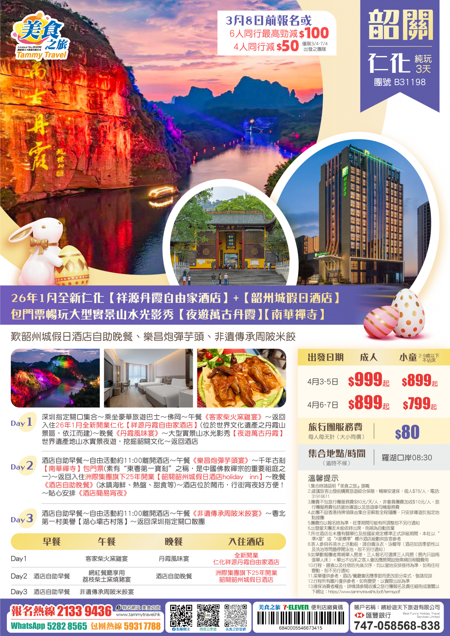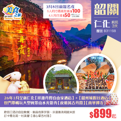 【26年復活節】26年1月全新仁化【祥源丹霞自由家酒店】+【韶州城假日酒店】、包門票暢玩大型實景山水光影秀【夜遊萬古丹霞】【南華禪寺】、歎韶州城假日酒店自助晚餐純玩3天