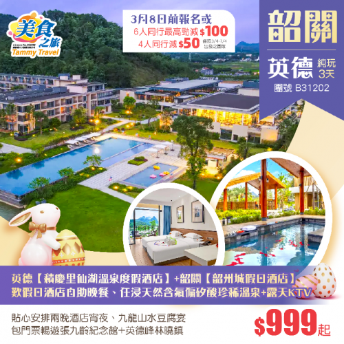【26年復活節】英德【積慶里仙湖溫泉度假酒店】+韶關【韶州城假日酒店】、歎假日酒店自助晚餐、任浸天然含氟偏矽酸珍稀溫泉+露天KTV、貼心安排兩晚酒店宵夜、包門票暢遊張九齡紀念館+英德峰林曉鎮純玩3天
