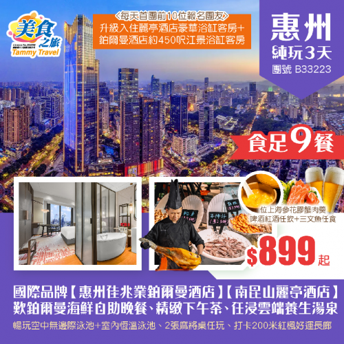 國際品牌靚酒店【惠州佳兆業鉑爾曼酒店】【南昆山麗亭酒店】、歎鉑爾曼酒店海鮮自助晚餐<位上海參花膠蟹肉羹>、尊享精緻下午茶、任浸雲端養生湯泉、暢玩空中無邊際泳池+室內恆溫泳池+2張麻將任玩 純玩3天