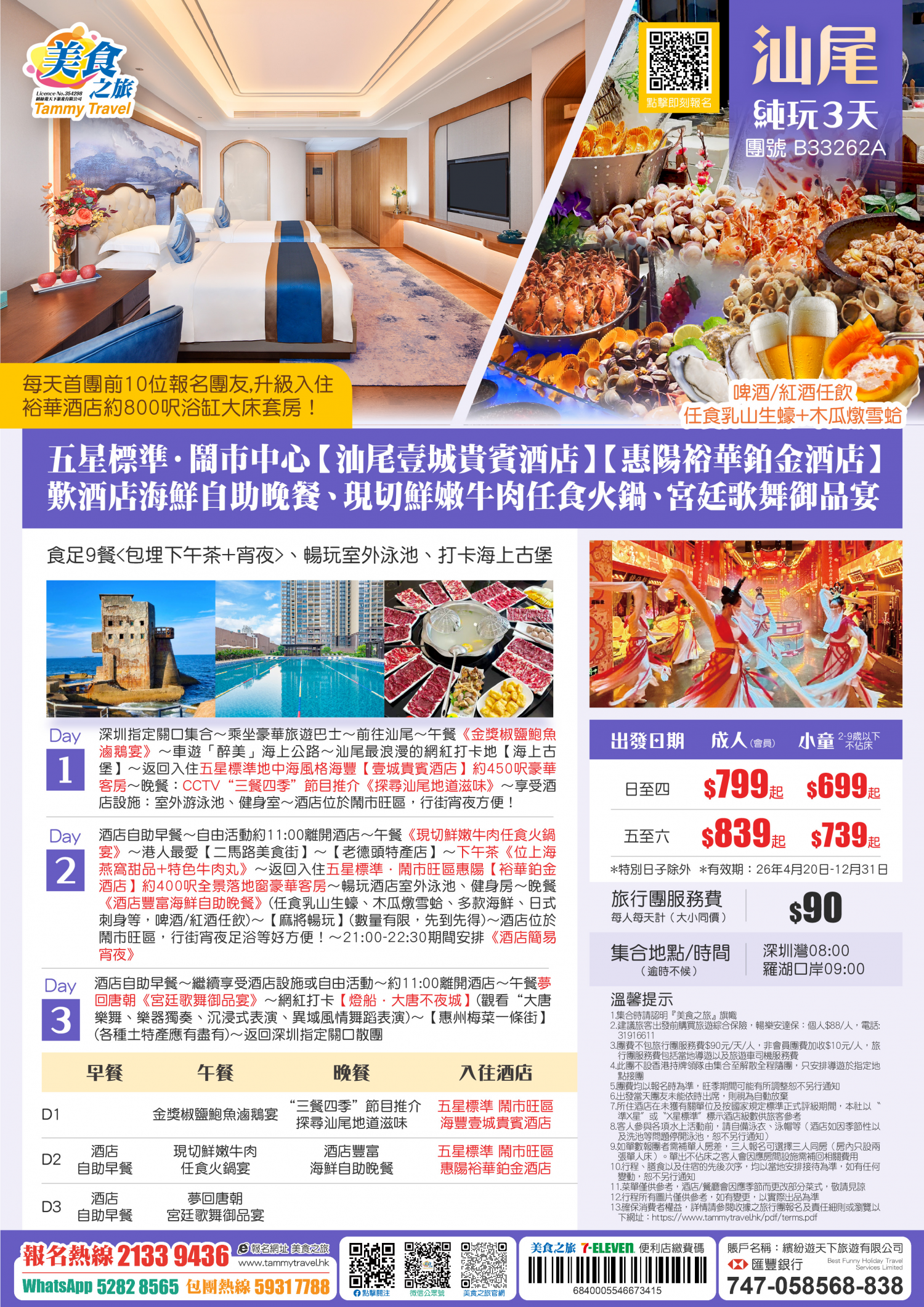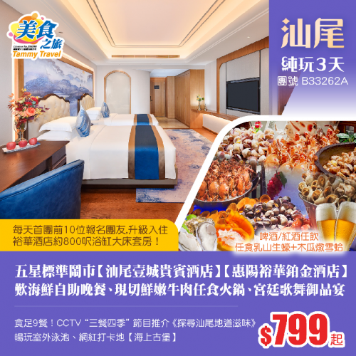 五星標準【汕尾壹城貴賓酒店】【惠陽裕華鉑金酒店】、食足9餐<包埋下午茶+宵夜>、歎酒店海鮮自助晚餐、宮廷歌舞御品宴、“三餐四季”節目推介探尋汕尾地道滋味、現切鮮嫩牛肉任食火鍋、暢玩室外泳池 純玩3天