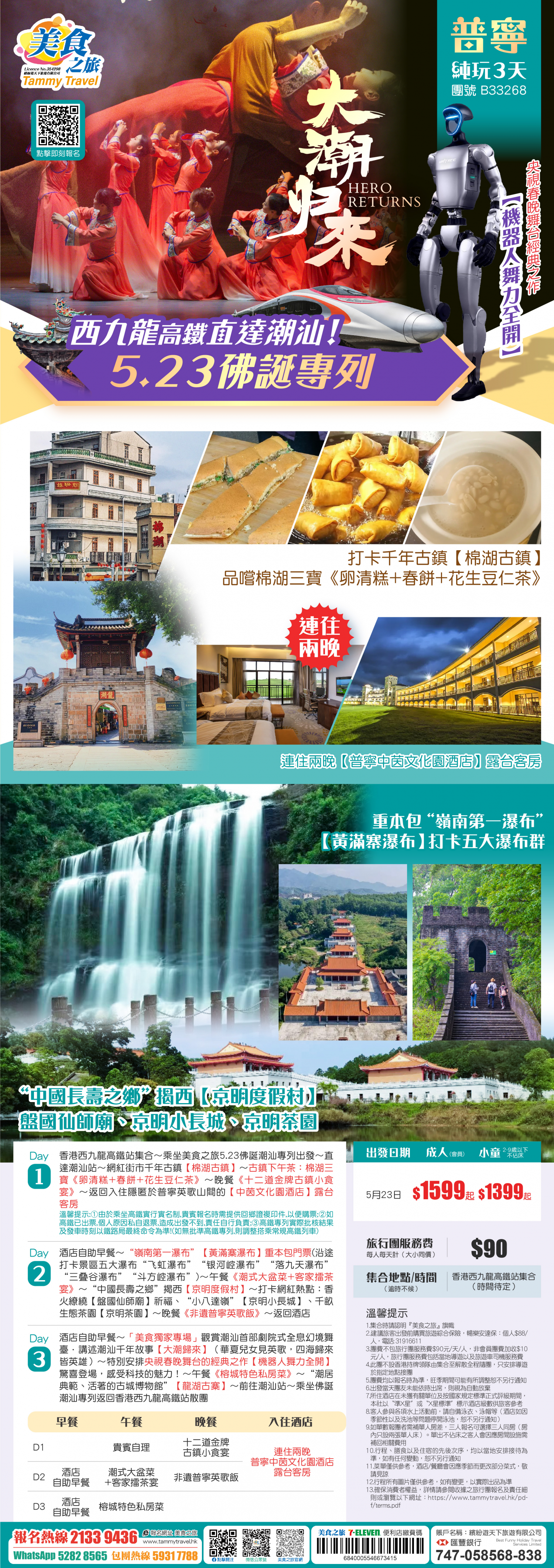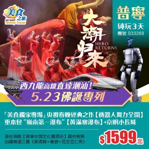 「西九直達潮汕-5.23佛誕專列」美食獨家專場【大潮歸來】+央視春晚舞台同款【機器人舞力全開】、打卡“嶺南第一瀑布”黃滿寨瀑布+京明小長城+棉湖古鎮+龍湖古寨、連住兩晚唔使搬行李!純玩3天