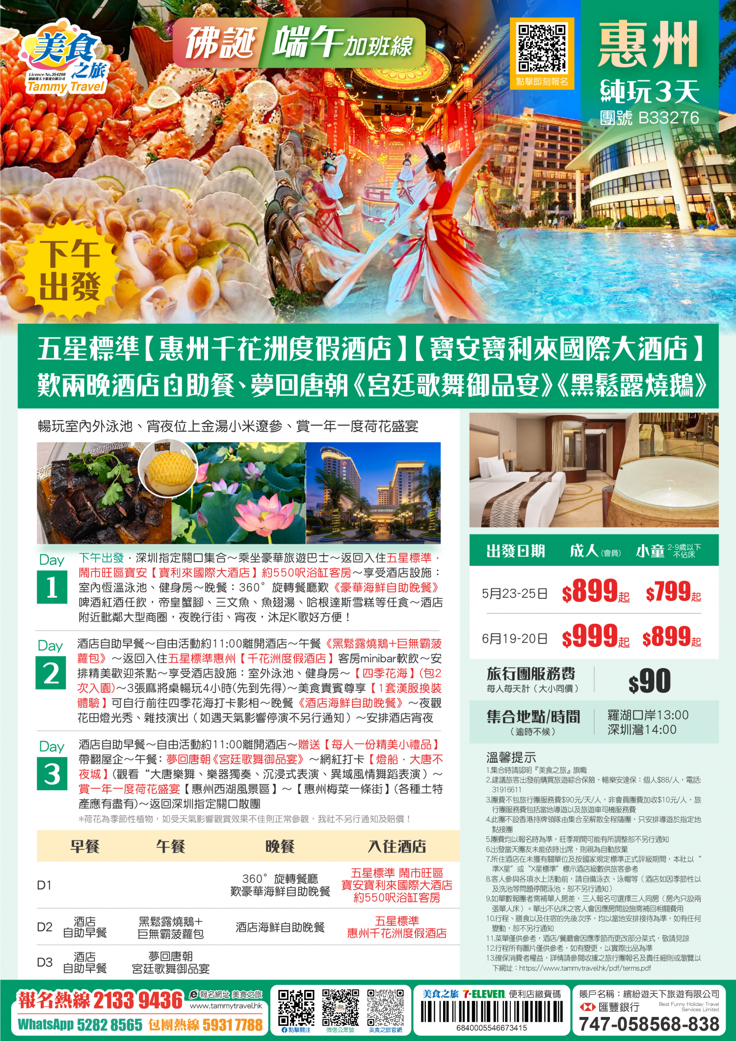 【26年佛誕節+端午節】下午出發!五星標準【惠州千花洲度假酒店】【寶安寶利來國際大酒店】歎兩晚酒店自助餐、夢回唐朝《宮廷歌舞御品宴》、暢玩室內外泳池、賞一年一度荷花盛宴 純玩3天