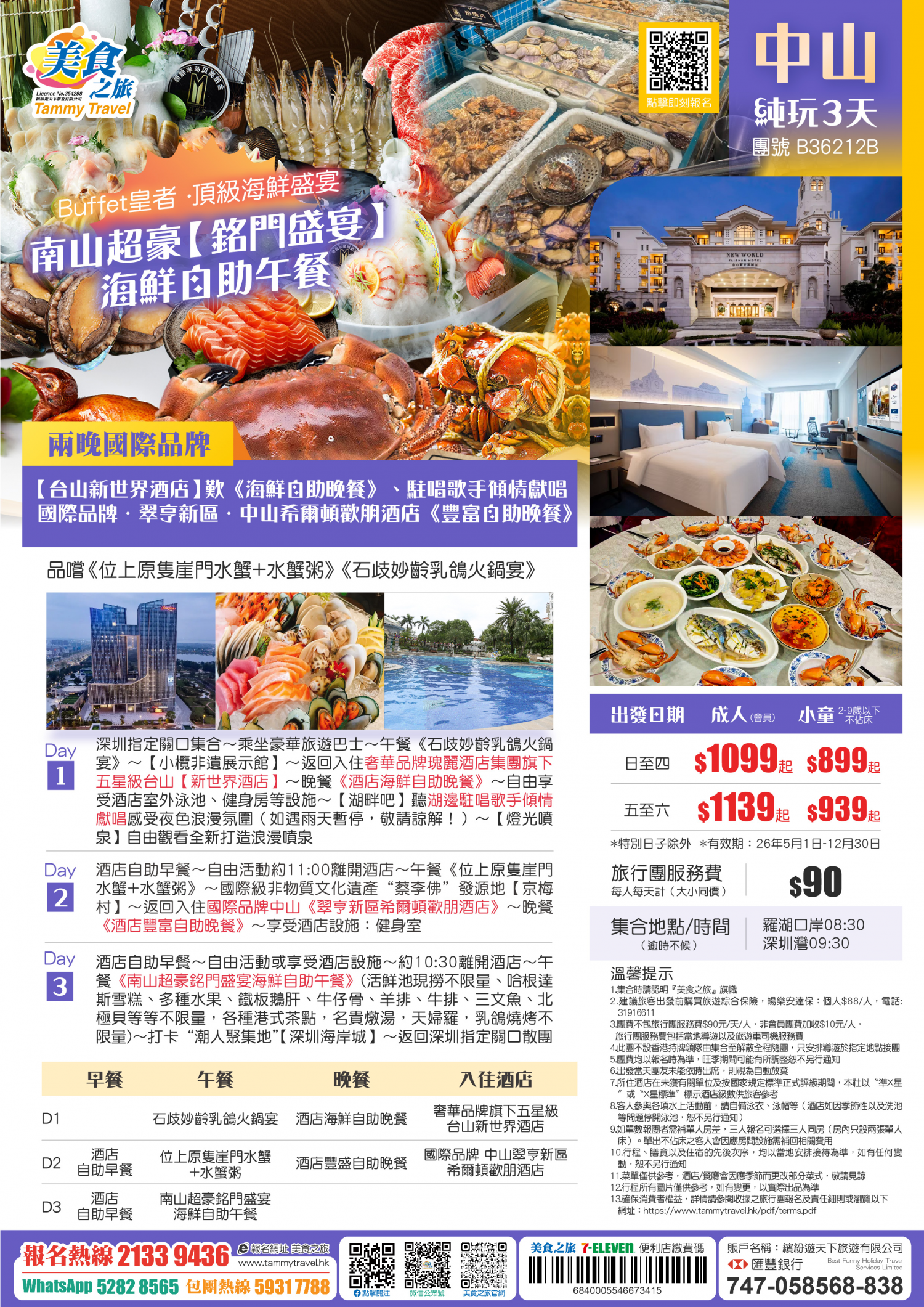 全程豪歎3大自助餐《超豪銘門盛宴海鮮自助午餐》+《兩晚酒店自助晚餐》、升級入住兩晚奢華品牌台山【新世界酒店】+中山翠亨新區【希爾頓歡朋酒店】純玩3天