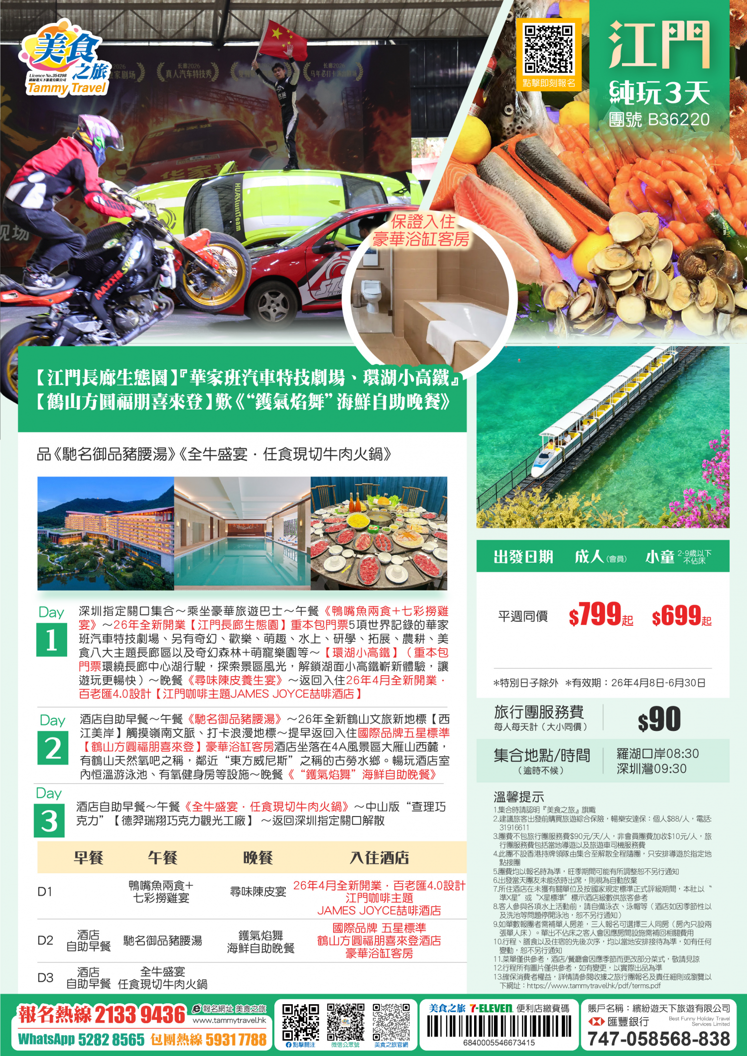 【長廊生態園】『華家班汽車特技劇場、環湖小高鐵』、國際品牌·五星標準【鶴山方圓福朋喜來登】保證入住高級浴缸客房、歎《“鑊氣焰舞”海鮮自助晚餐》、品《馳名御品豬腰湯》《全牛盛宴·任食現切牛肉》 純玩3天