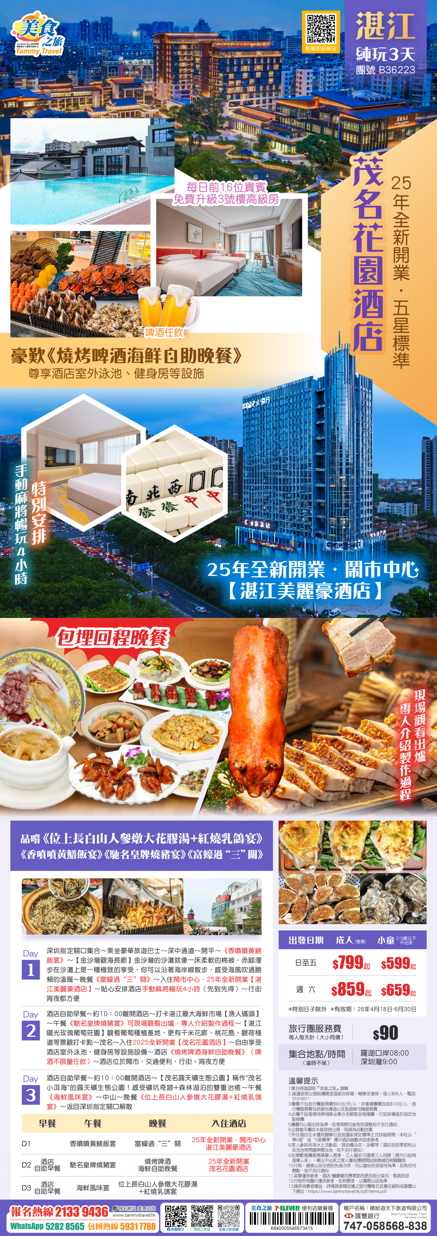 【包埋回程晚餐】25年全新開業【湛江美麗豪酒店】暢玩麻雀4小時、五星標準【茂名花園酒店】歎《燒烤啤酒海鮮自助晚餐》啤酒任飲、品《馳名皇牌燒豬宴》《富蠔過“三”關》 純玩3天