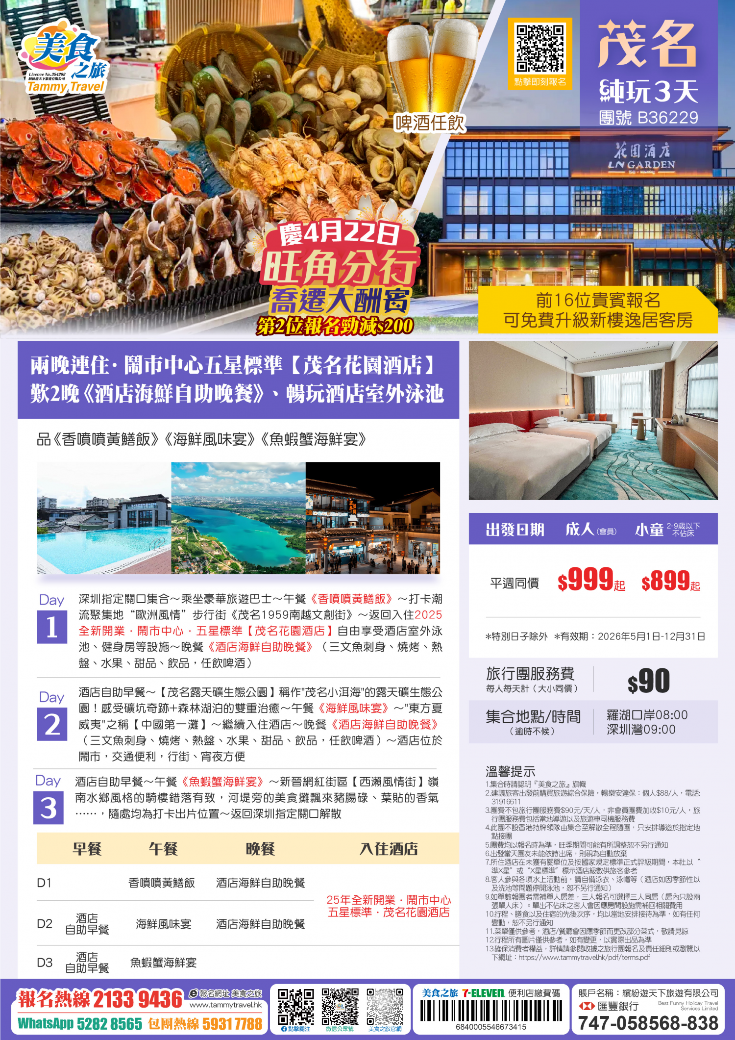【第二位勁減$200】唔洗搬行李·兩晚連住·鬧市中心·五星標準【茂名花園酒店】 豪歎2晚《海鮮自助晚餐》、暢玩酒店室外泳池、健身房、品《香噴噴黃鱔飯》《海鮮風味宴》《一人一隻醬烤鮑魚海鮮宴》 純玩3天