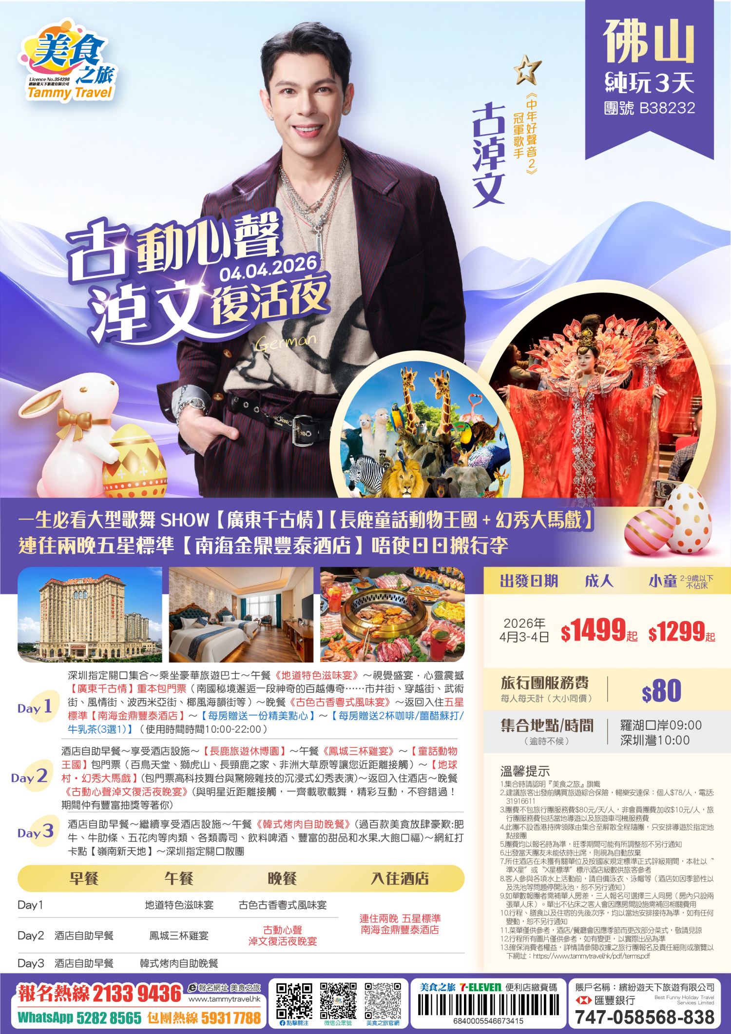 【26年古淖文復活節晚會】重本包【廣東千古情+長鹿童話動物王國+幻秀大馬戲】、 兩晚連住五星標準【南海金鼎豐泰酒店】唔使日日搬行李、豪歎《韓式烤肉自助晚餐》純玩3天