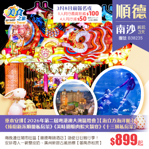 【26年復活節】重本安排【2026年第二屆粵港澳大灣區燈會】+【海立方海洋館】、皇牌推介《臻廚新派順德私房菜》《美味園脆肉鯇火鍋》《十三姨私房菜》、兩晚連住鬧市【順德哥頓酒店】純玩3天