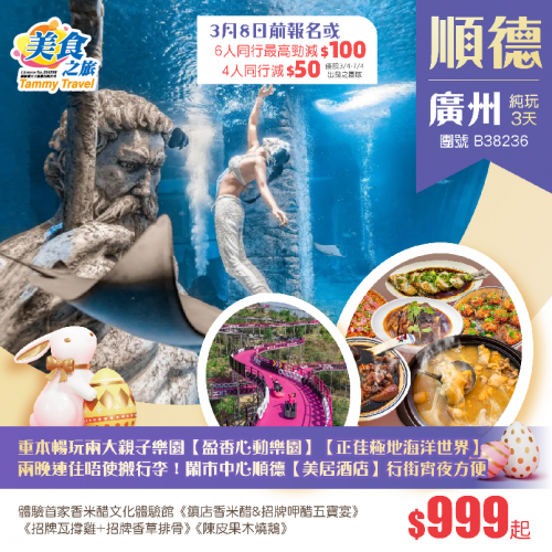 【26年復活節】重本暢玩兩大親子樂園【盈香心動樂園】+【正佳極地海洋世界】、兩晚連住唔使搬行李!鬧市中心順德【美居酒店】、品嚐瓦撐雞+香草排骨+果木燒鵝純玩3天