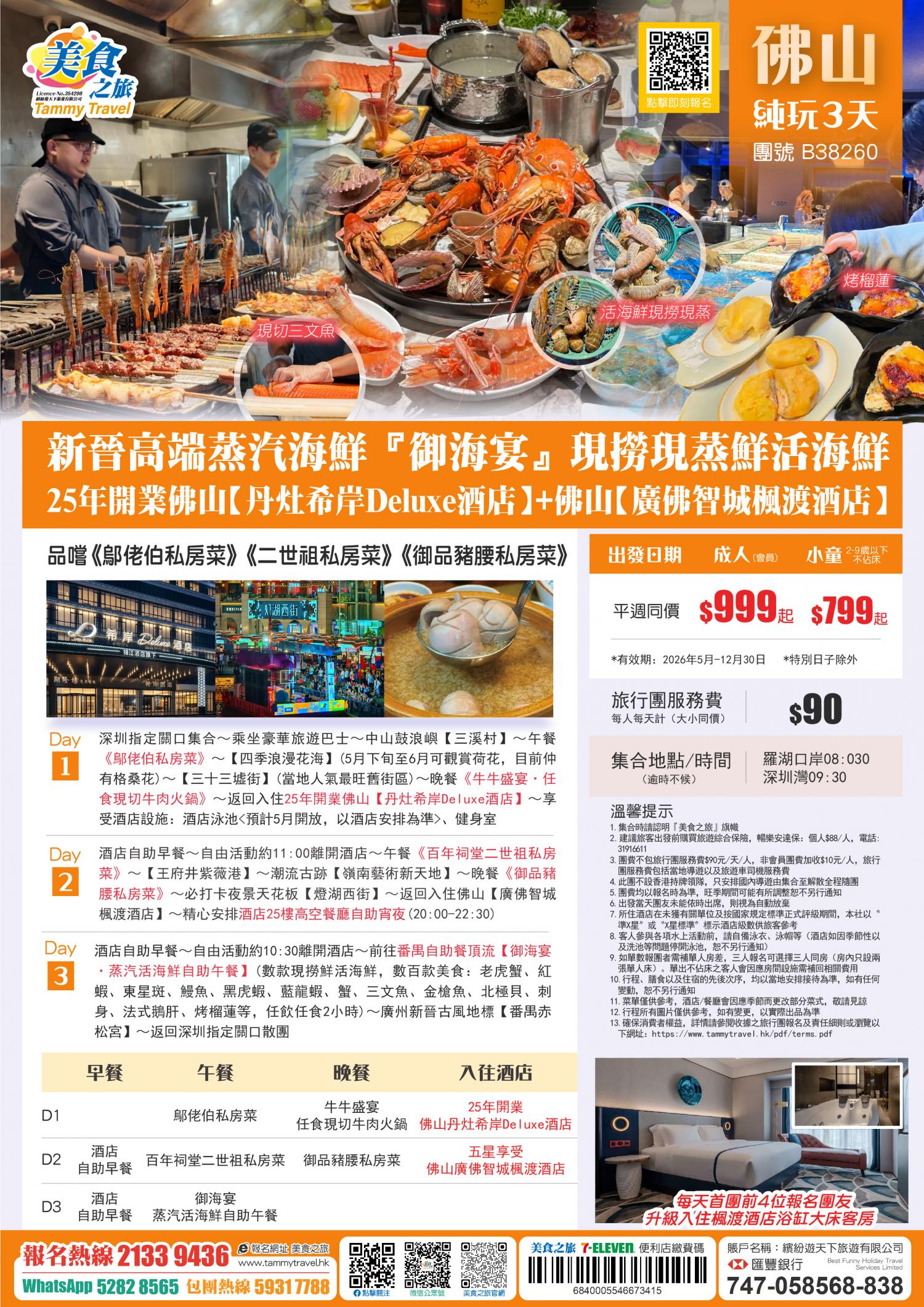 新晉高端蒸汽自助餐『御海宴』現撈現蒸鮮活海鮮+皇牌推介《鄔佬伯私房菜》《二世祖私房菜》《御品豬腰私房菜》、25年開業佛山【丹灶希岸Deluxe酒店】+佛山【廣佛智城楓渡酒店】純玩3天