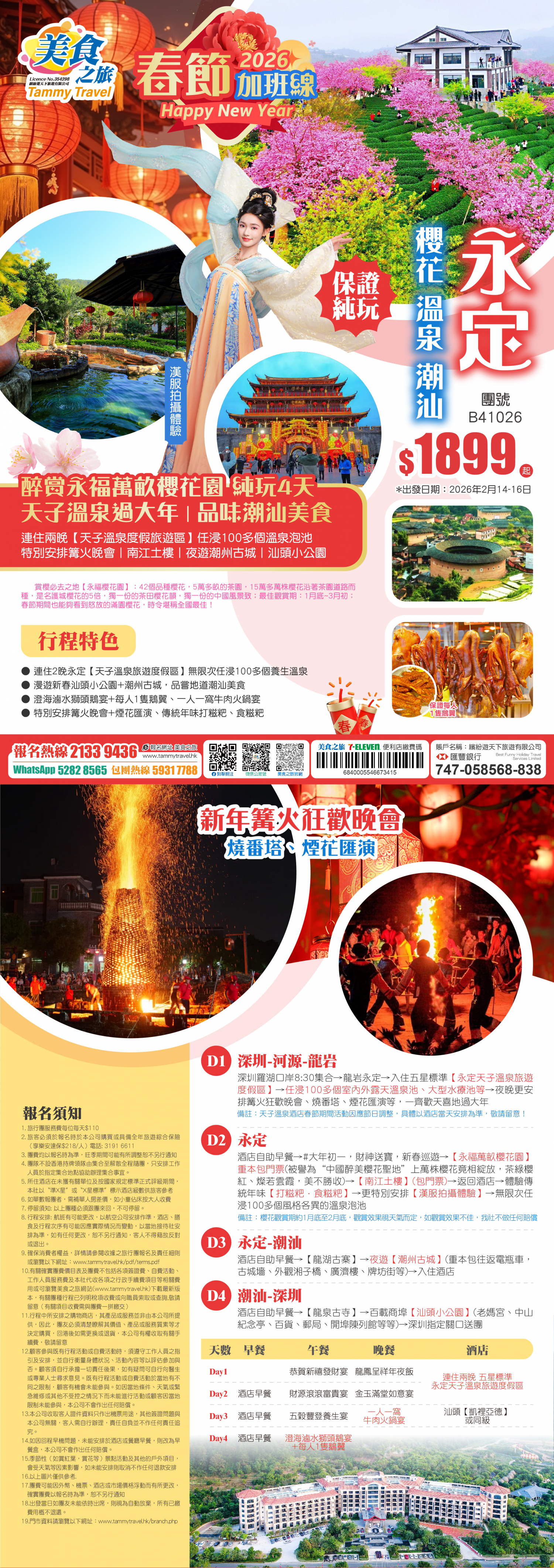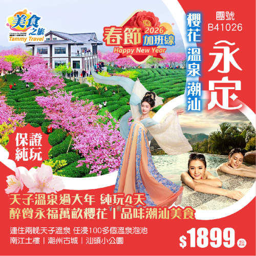純玩【2026春節加班線】兩晚連住永定【天子溫泉度假旅遊區】過大年丨醉賞<永福萬畝櫻花園>丨暢遊世界文化遺產【南溪土樓群】丨潮州古城丨汕頭小公園丨4天巴士團