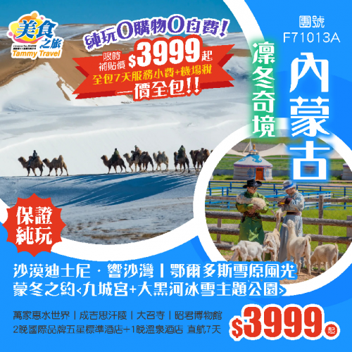 限時補貼純玩0購物0自費【香港直航呼和浩特】沙漠迪士尼·響沙灣丨鄂爾多斯雪原風光<九城宮+大黑河冰雪主題公園>萬家惠水世界丨成吉思汗陵丨大召寺丨2晚國際品牌五星標準酒店+1晚溫泉酒店直航7天