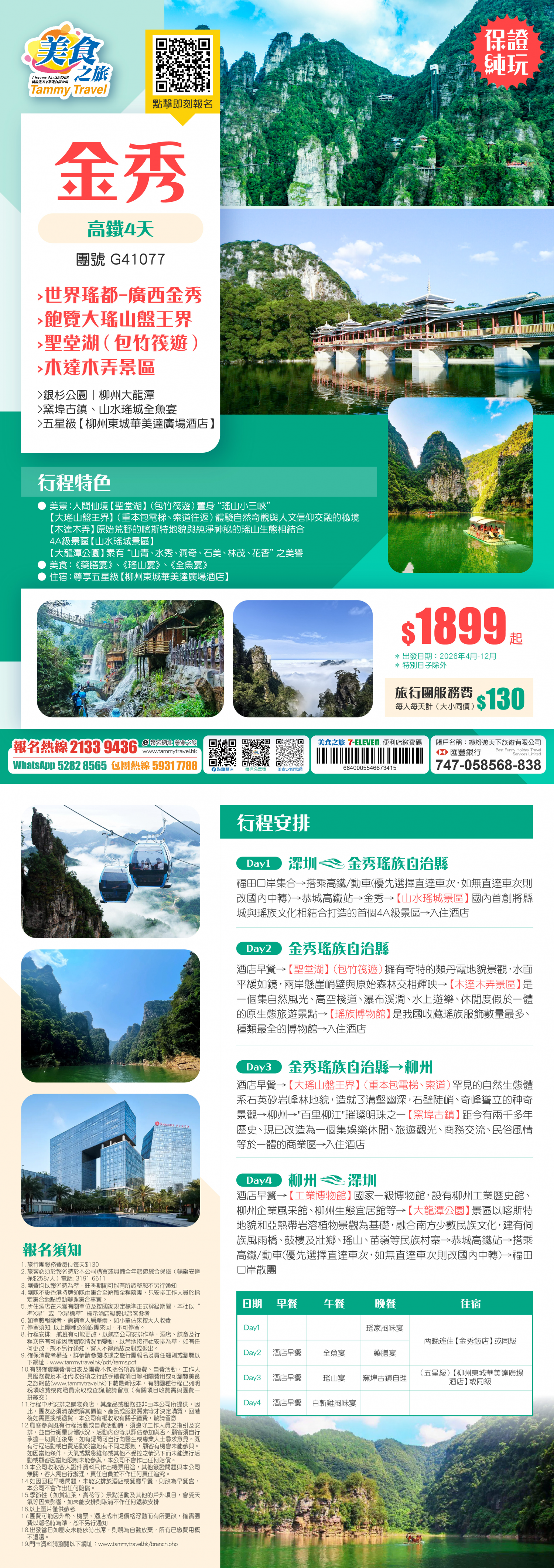 【純玩無自費】世界瑤都-廣西金秀、飽覽大瑤山盤王界、聖堂湖、木達木弄、山水瑤城、柳州大龍潭、窯埠古鎮、尊享五星級【柳州東城華美達廣場酒店】純玩4天高鐵團