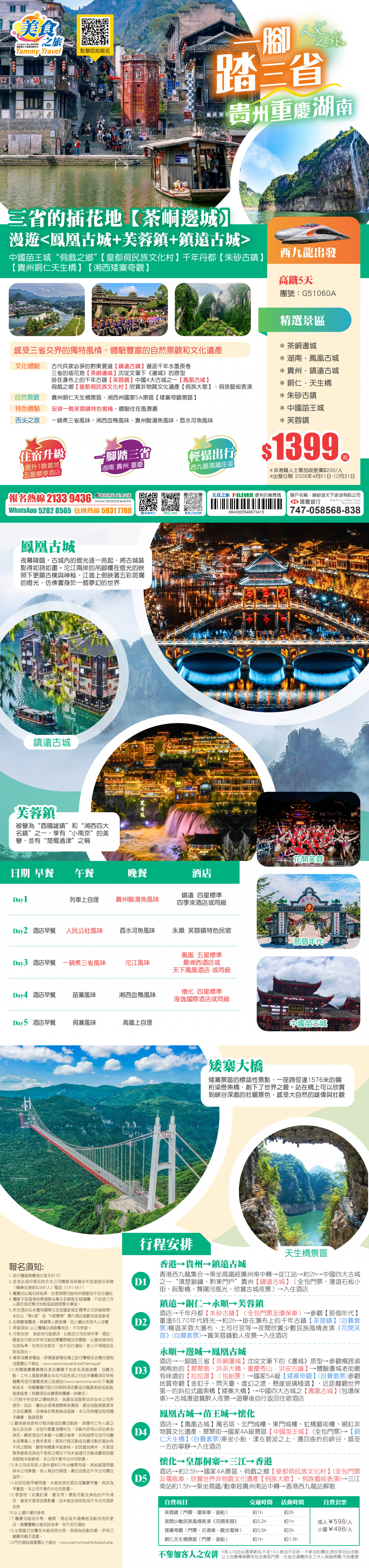 <西九龍往返>【一腳踏三省·貴州 重慶 湖南】三省的插花地【茶峒邊城】漫遊3大古城<鳳凰古城+芙蓉鎮+鎮遠古城>中國苗王城、皇都侗民族文化村、朱砂古鎮、高鐵5天
