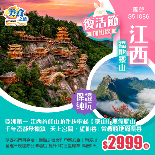 【2026復活節·純玩江西】亞洲第一 江西首條山頂手扶電梯【靈山】無痛爬山丨仙俠世界望仙谷丨賞櫻勝地鳳凰谷丨船遊月亮灣丨體驗非遺製作紙傘丨景德鎮陶溪川丨全程4晚國際品牌酒店 提升1晚五星標準 高鐵5天