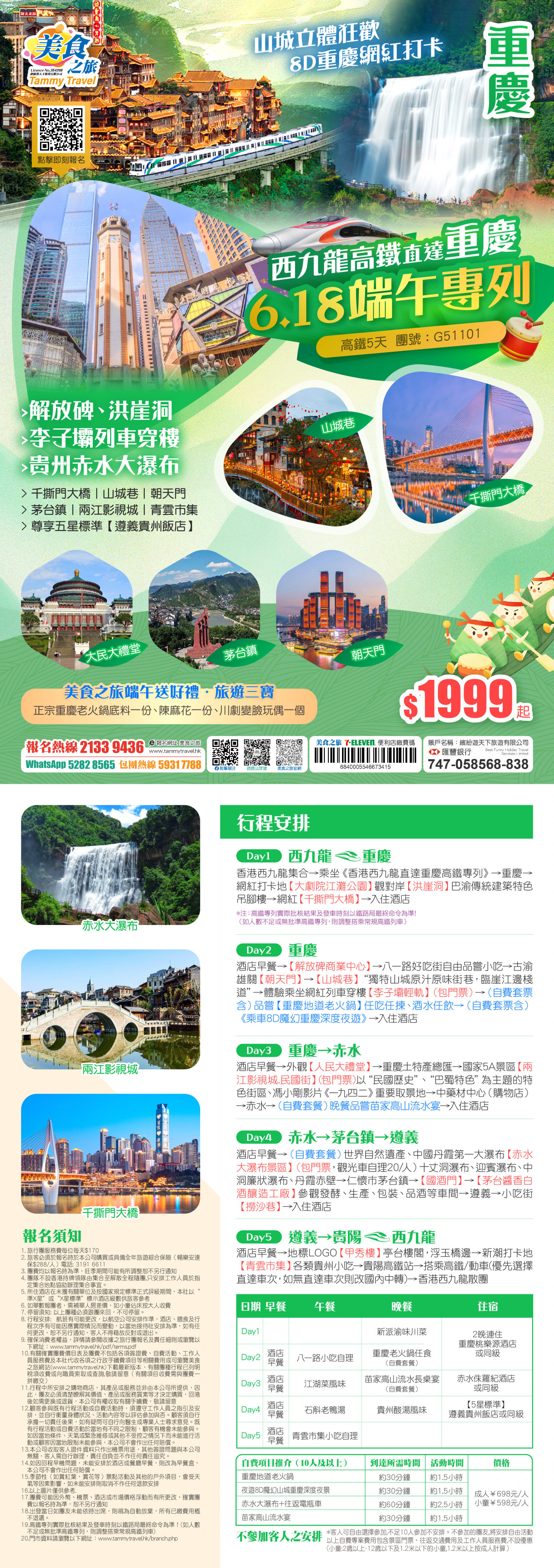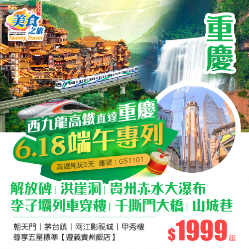 重慶+貴州【端午節6月18香港西九龍高鐵直達重慶專列】山城立體狂歡· 8D重慶網紅打卡:解放碑、兩江影視城、山城巷、李子壩列車穿樓、貴州赤水大瀑布、茅臺鎮、甲秀樓、5天高鐵團