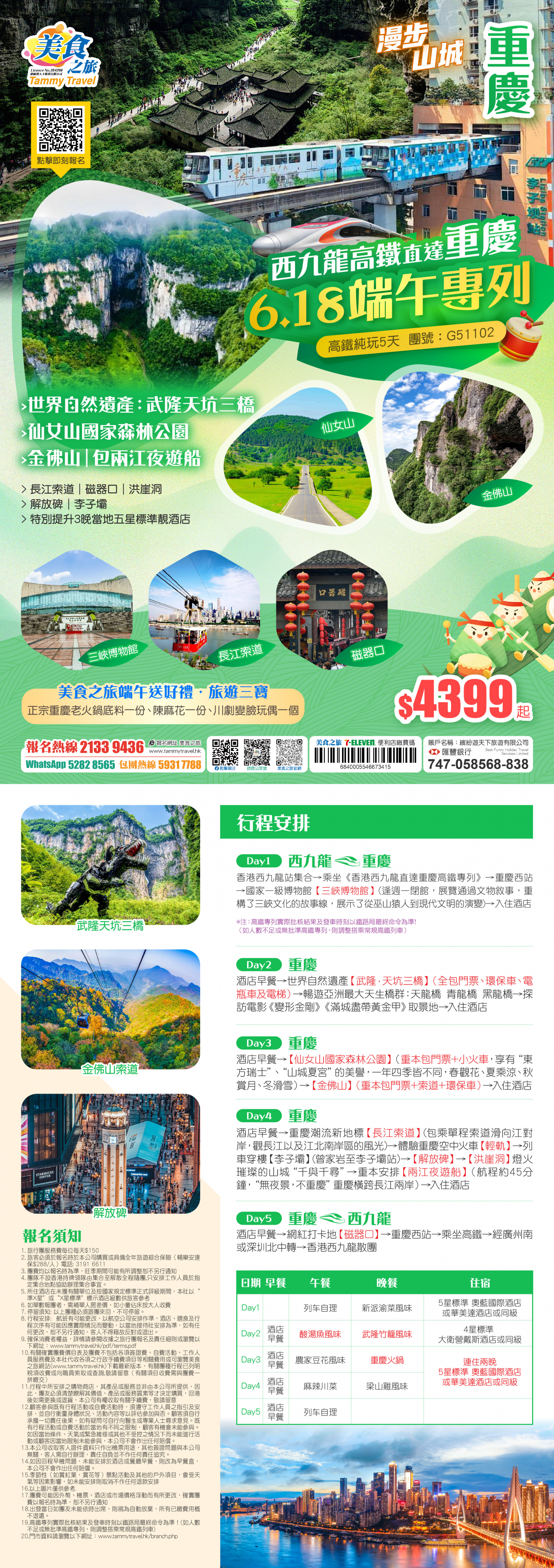 純玩無購物無自費【端午節6月18香港西九龍高鐵直達重慶專列】世界自然遺產【武隆天生三橋】 金佛山 仙女山國家森林公園 包兩江夜遊船 長江索道|磁器口|洪崖洞|解放碑 |李子壩 高鐵5天團