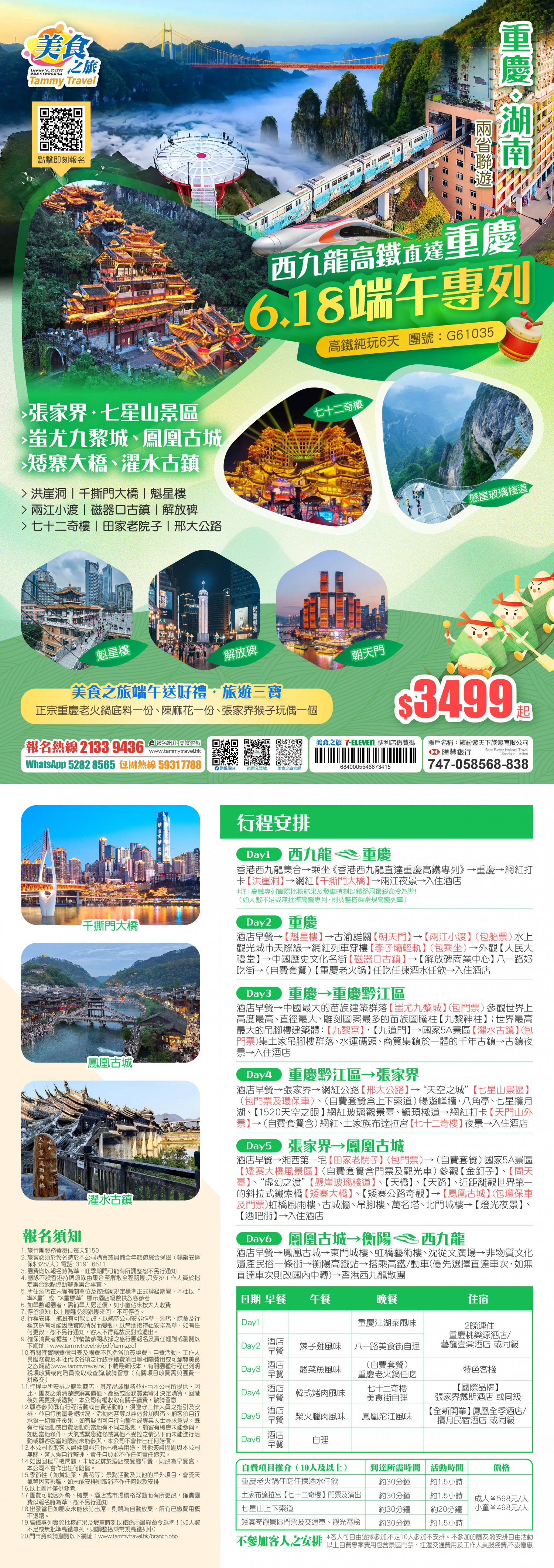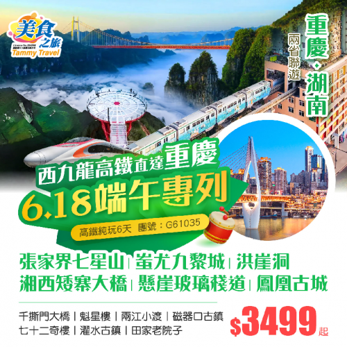 純玩【端午節6月18香港西九龍高鐵直達重慶專列】重慶湖南兩省聯遊、暢遊重慶市區精華網紅景點、張家界七星山、七十二奇樓、湘西矮寨大橋、蚩尤九黎城、鳳凰古城、濯水古鎮純玩6天高鐵團