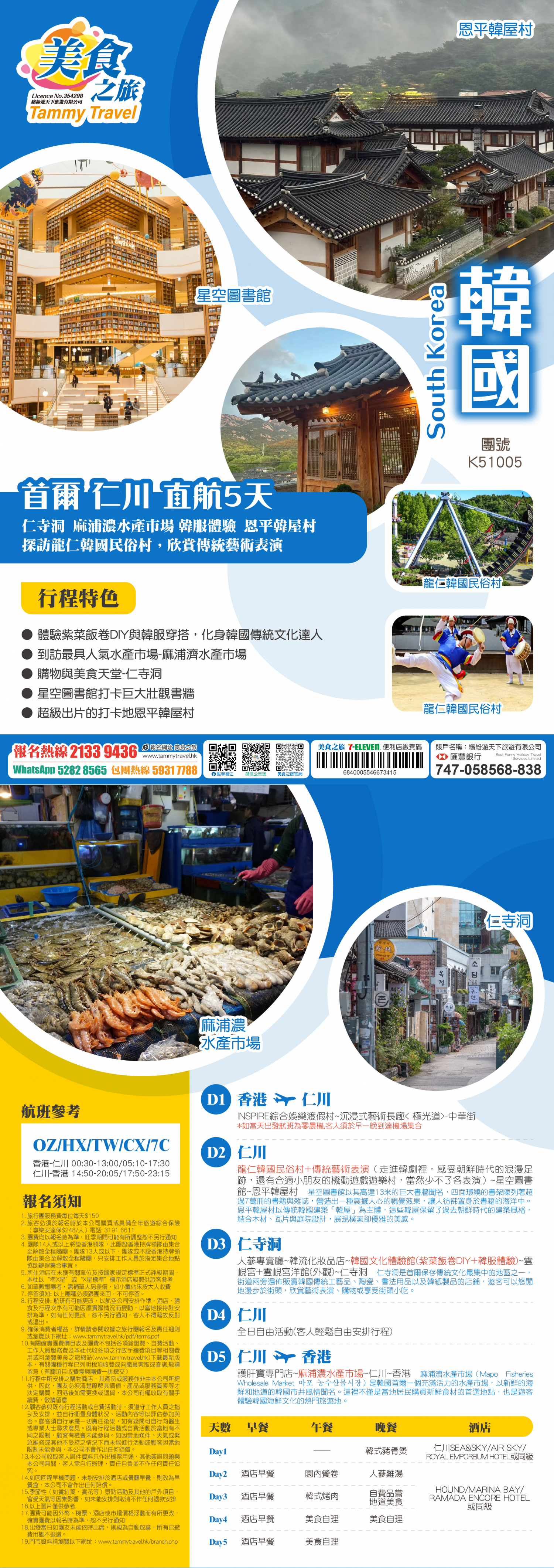 首爾"仁川 直航5天 仁寺洞 麻浦濃水產巿場 韓服體驗 恩平韓屋村探訪龍仁韓國民俗村,欣賞傳統藝術表演