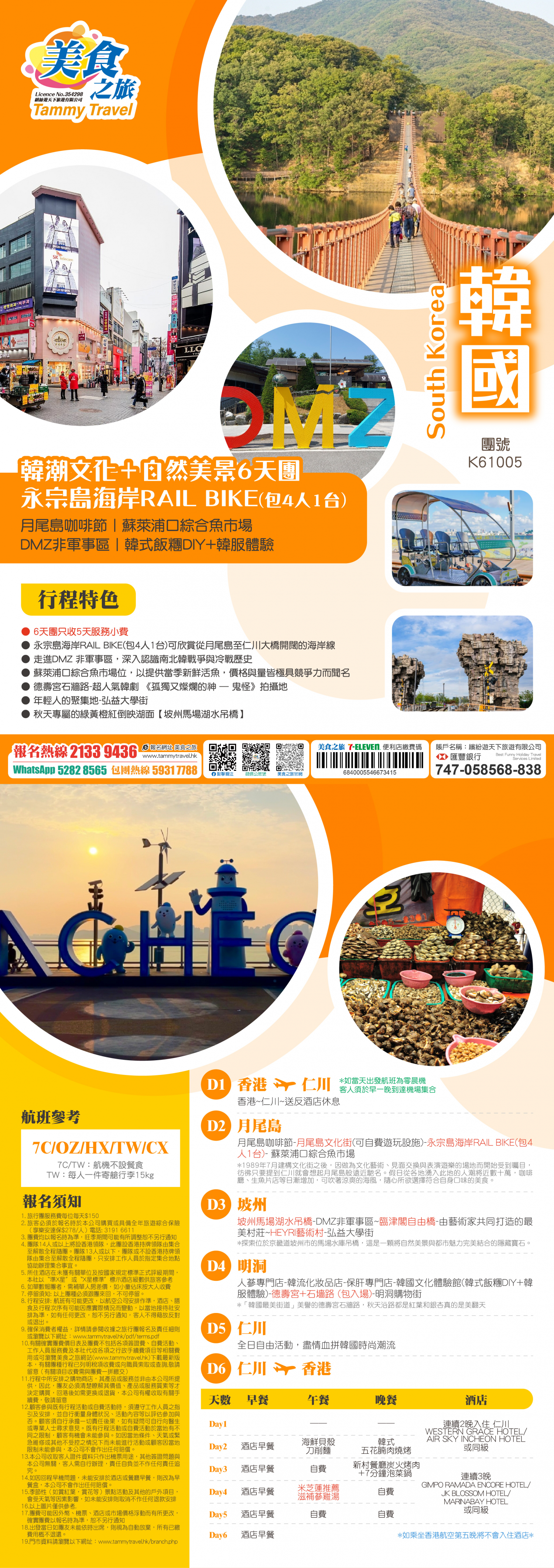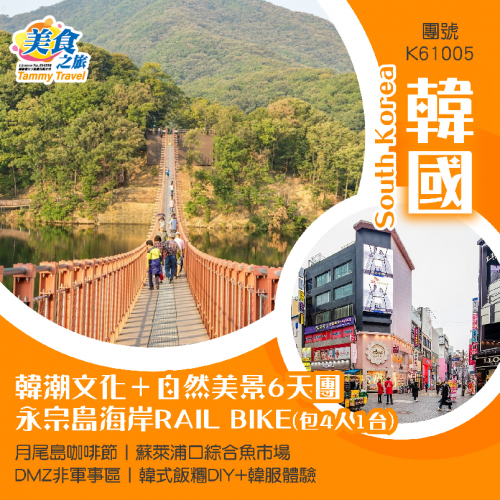 韓潮文化+自然美景6天團 永宗島海岸RAIL BIKE(包4人1台)/ 月尾島咖啡節/蘇萊浦口綜合魚市場/ DMZ非軍事區/韓式飯糰DIY+韓服體驗