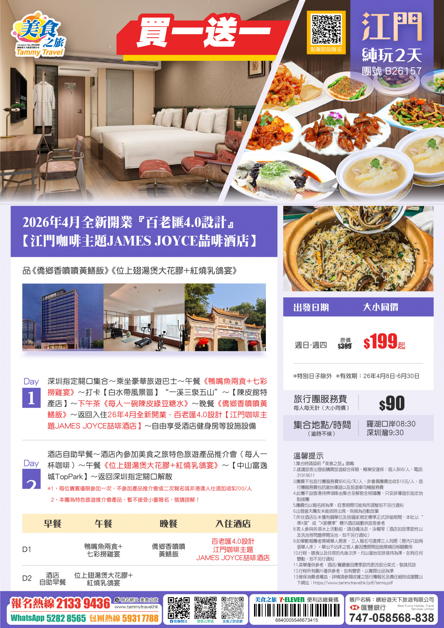 【買一送一】【中國長線產品推介會】26年4月全新開業·百老匯4.0設計【江門咖啡主題JAMES JOYCE喆啡酒店】、品《鴨嘴魚兩食宴》《僑鄉香噴噴黃鱔飯》《位上翅湯煲大花膠+紅燒乳鴿宴》純玩2天