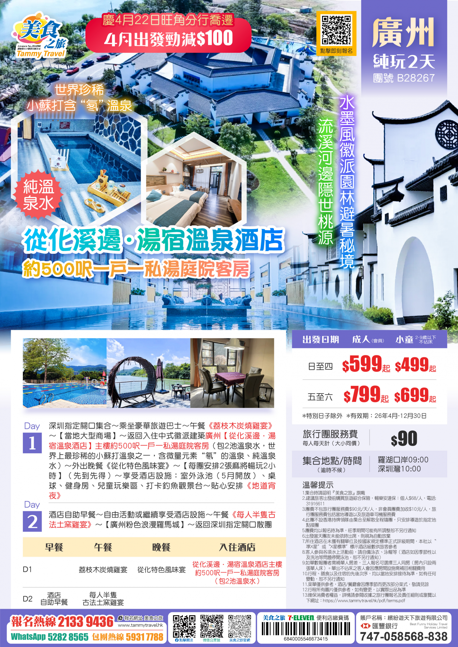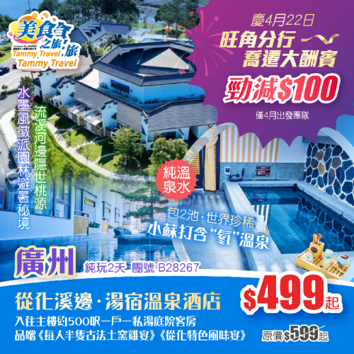 「流溪河邊隱世桃源」【從化溪邊·湯宿溫泉酒店】主樓約500呎一戶一私湯庭院客房、浸獨立私家庭院溫泉、美食推介《每人半隻古法土窯雞宴》《從化特色風味宴》、包埋地道宵夜純玩2天