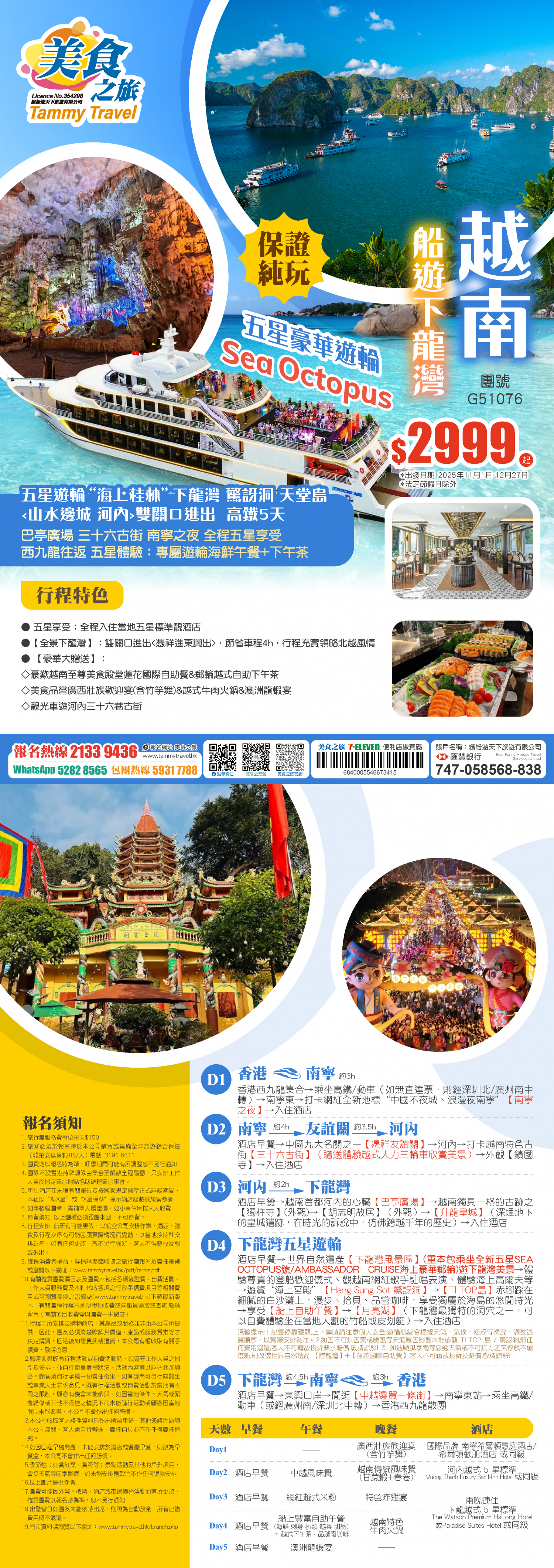 【五星遊輪】:【SEA OCTOPUS號/AMBASSADOR CRUISE】漫遊世界自然遺產【下龍灣】天堂島、驚訝洞