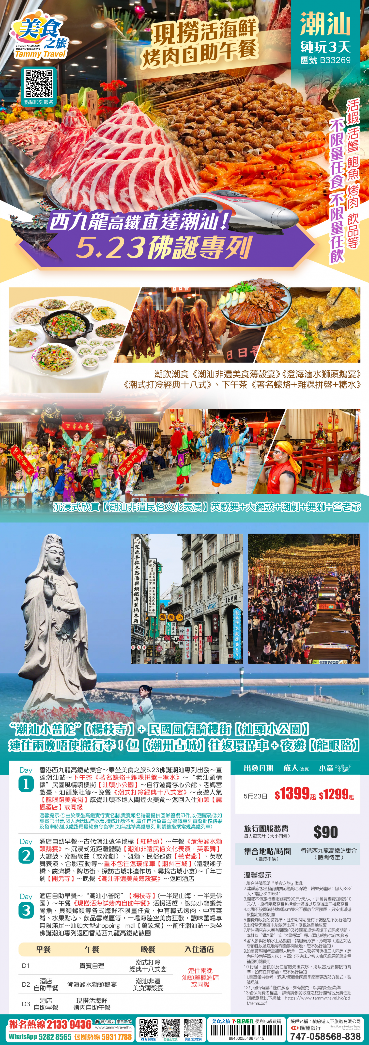 「西九直達潮汕-5.23佛誕專列」潮飲潮食《現撈活海鮮烤肉自助午餐》《潮汕非遺薄殼宴》《滷水獅頭鵝》、潮汕非遺民俗文化表演+“潮汕小普陀”楊枝寺+夜遊龍眼路+潮州古城、連住兩晚唔使搬行李!純玩3天