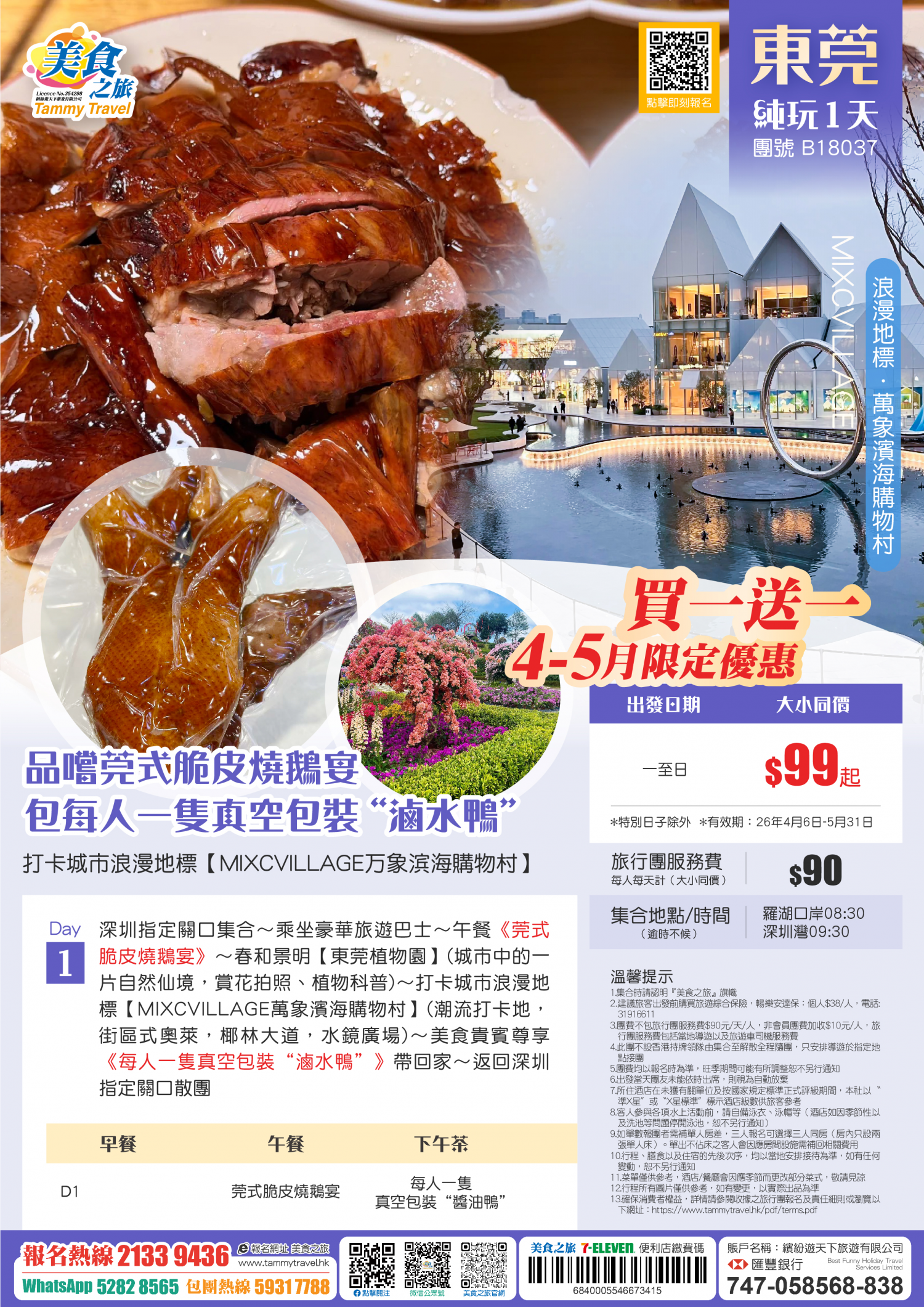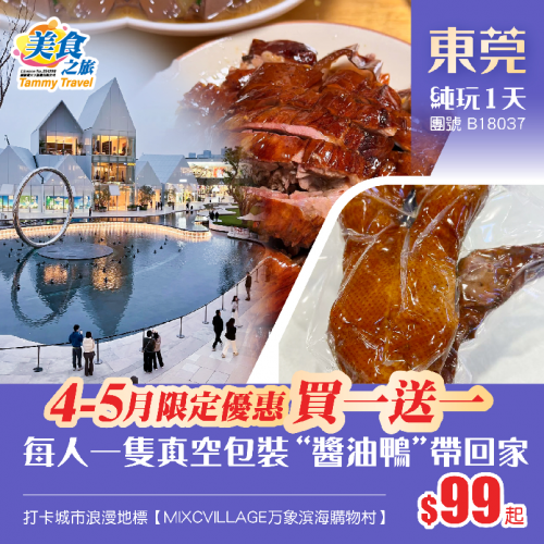【買一送一】品嚐莞式脆皮燒鵝宴+包每人一隻真空包裝“滷水鴨”帶回家、打卡城市浪漫地標【MIXCVILLAGE万象滨海購物村】純玩1天