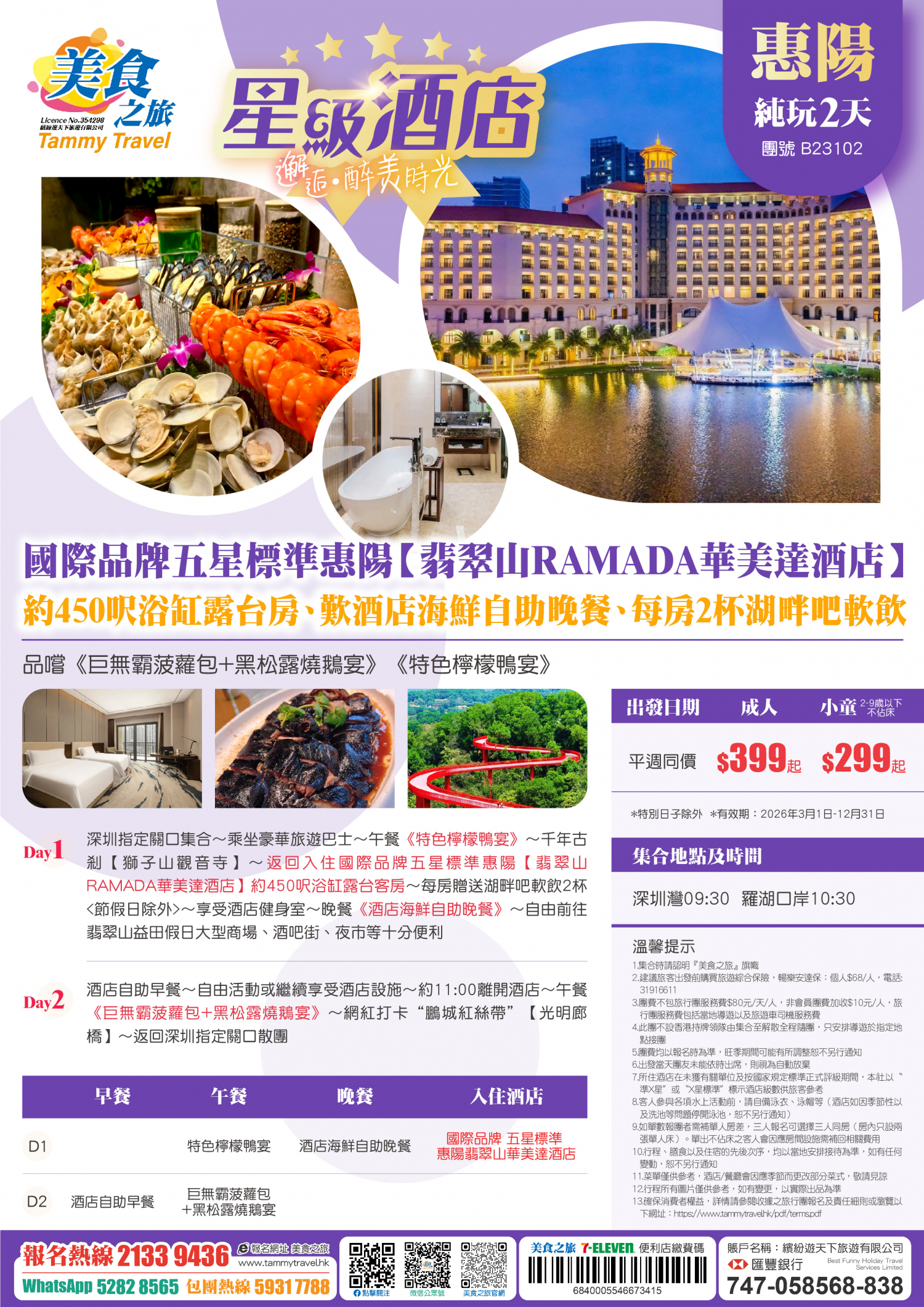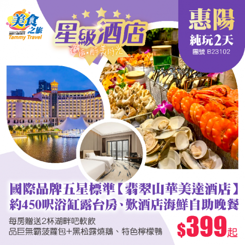 國際品牌五星標準惠陽【翡翠山RAMADA華美達酒店】約450呎浴缸露台客房、歎酒店海鮮自助晚餐、每房2杯湖畔吧軟飲、品嚐《巨無霸菠蘿包+黑松露燒鵝宴》《特色檸檬鴨宴》純玩2天