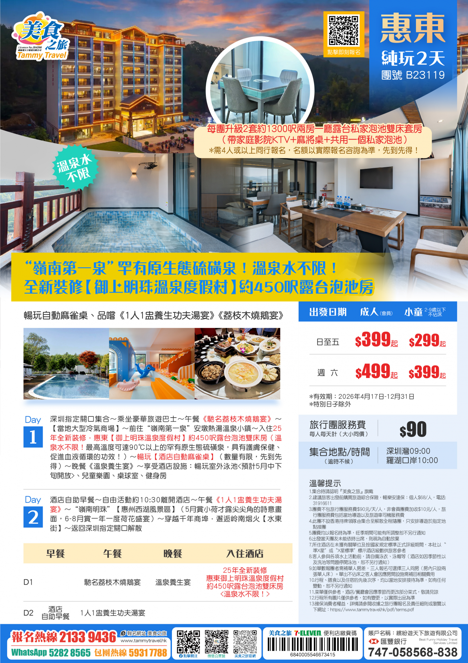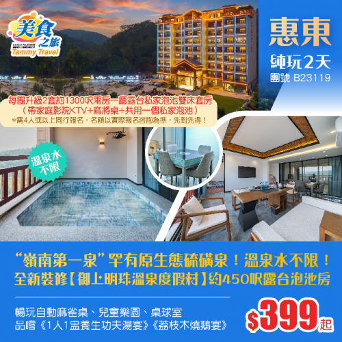 「嶺南第一泉」罕有原生態硫磺泉!25年全新裝修【御上明珠溫泉度假村】約450呎露台泡池雙床房<溫泉水不限>、暢玩自動麻雀桌、品嚐《1人1盅養生功夫湯宴》《荔枝木燒鵝宴》純玩2天