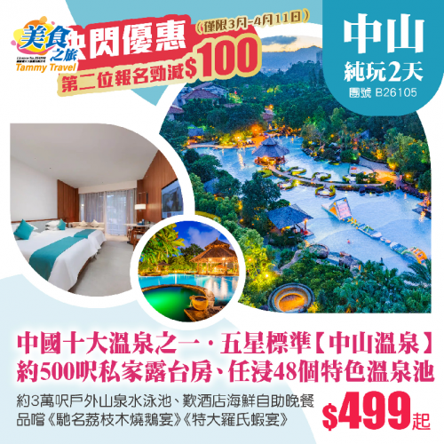 「中國十大溫泉之一·嶺南名湯」五星標準【中山溫泉】約500呎私家露台客房、任浸48個特色天然溫泉池、暢玩約3萬呎戶外山泉水泳池、歎酒店繽紛海鮮自助晚餐 純玩2天