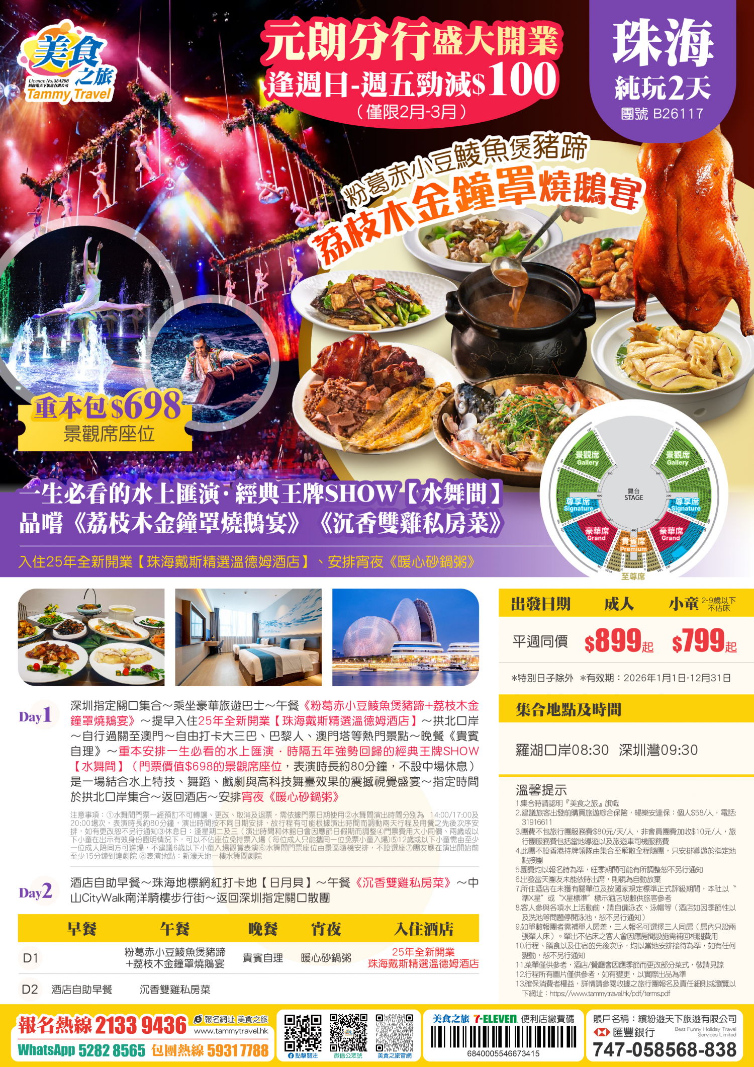 「經典王牌SHOW」一生必看的水上匯演【水舞間】重本包價值$698景觀席門票、 皇牌推介《粉葛赤小豆鯪魚煲豬蹄+荔枝木金鐘罩燒鵝宴》《沉香雙雞私房菜》、包埋宵夜《暖心砂鍋粥》純玩2天