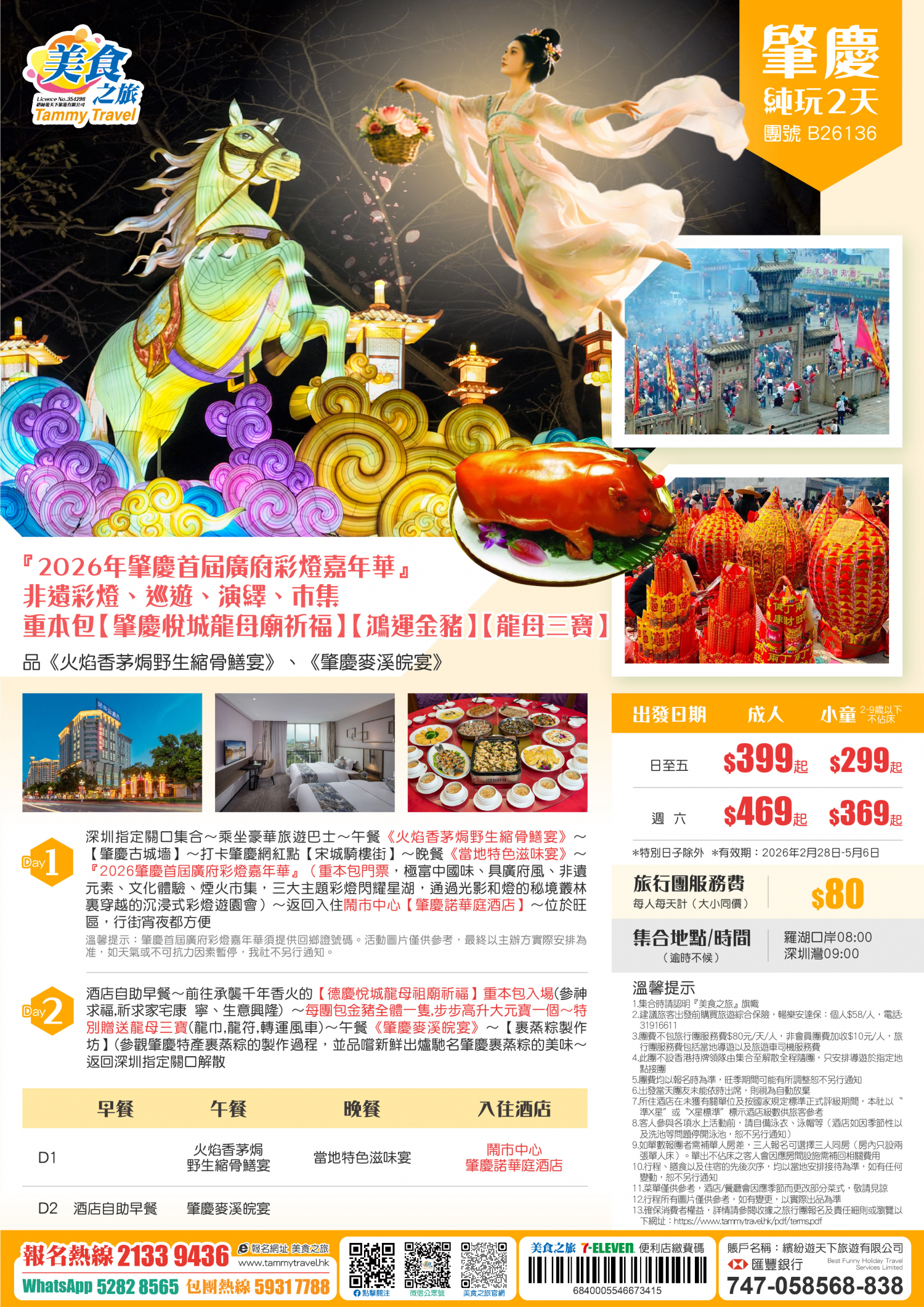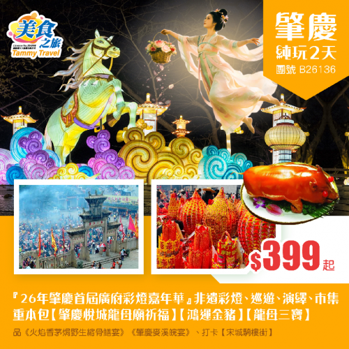 『2026年肇慶首屆廣府彩燈嘉年華』非遺彩燈、巡遊、演繹、市集、 重本包【肇慶悅城龍母廟祈福】【鴻運金豬】【龍母三寶】、 品《火焰香茅焗野生縮骨鱔宴》、《肇慶麥溪皖宴》 純玩2天