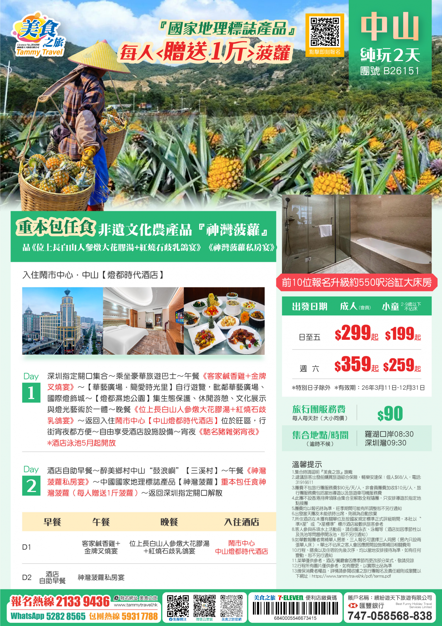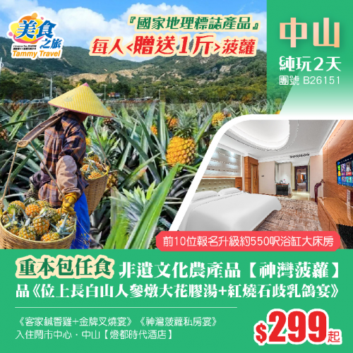 任食『國家地理標誌產品』非物質文化遺產【神灣菠蘿】、 品《位上長白山人參燉大花膠湯+紅燒石歧乳鴿宴》《中山神灣菠蘿美食私房宴》 、鬧市中心·中山【燈都時代酒店】 純玩2天