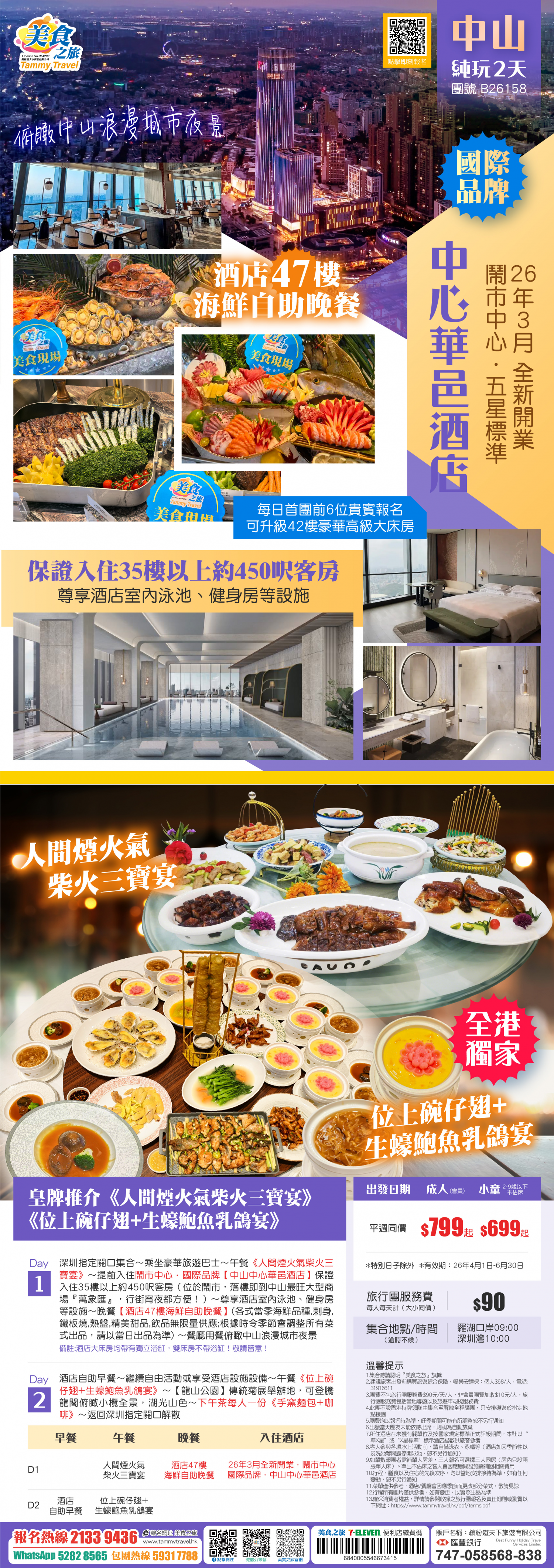26年3月全新開業鬧市中心·國際品牌【中山中心華邑酒店】 保證入住35樓以上約450呎客房、歎【47樓海鮮自助晚餐】、 皇牌推介《人間煙火氣柴火三寶宴》《位上碗仔翅+生蠔鮑魚乳鴿宴》 純玩2天