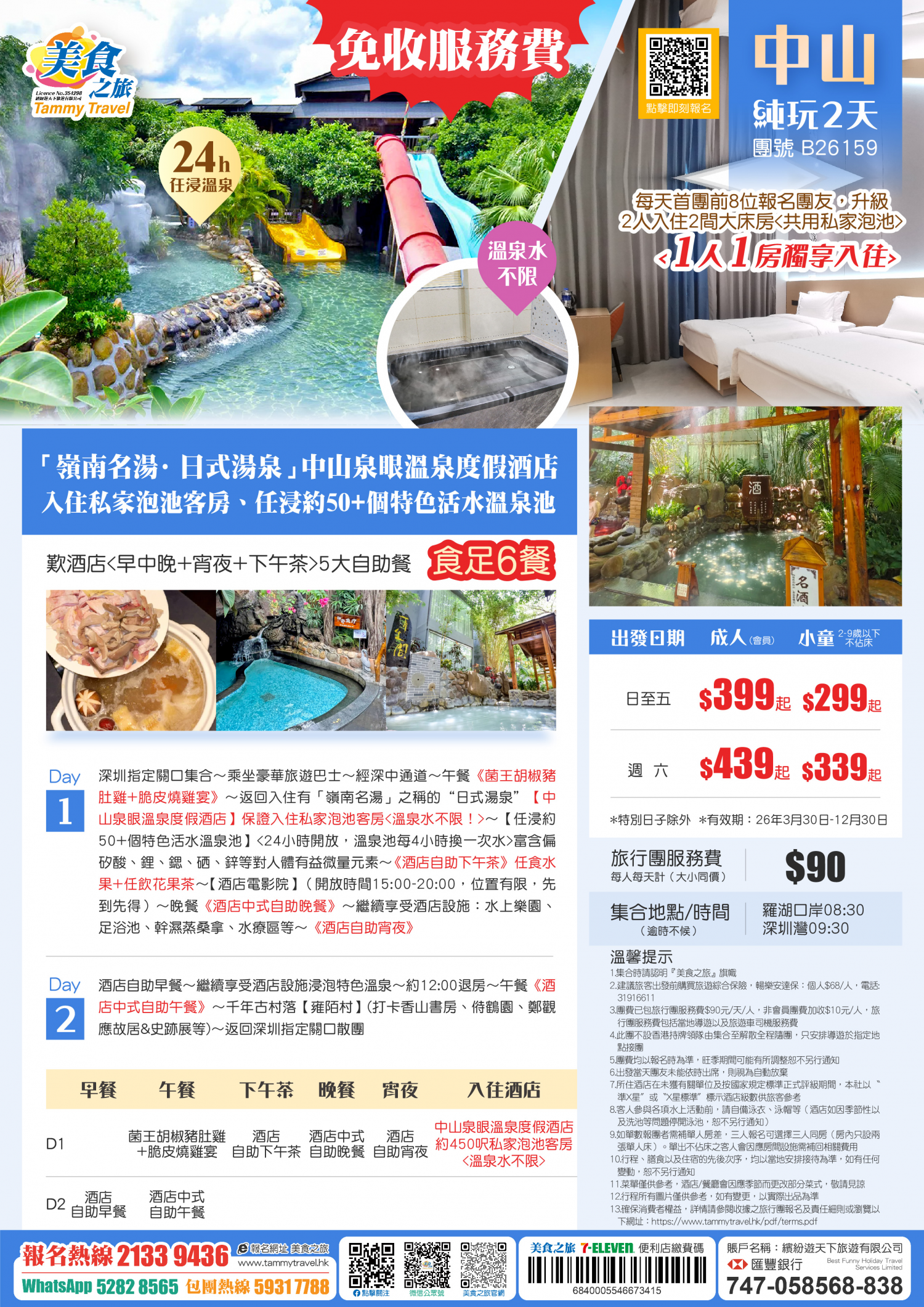 「免收服務費」嶺南名湯·日式湯泉【中山泉眼溫泉度假酒店】私家泡池客房<溫泉水不限!>、任浸約50+個特色活水溫泉池<24小時開放>、歎酒店<早中晚+宵夜+下午茶>5大自助餐 純玩2天
