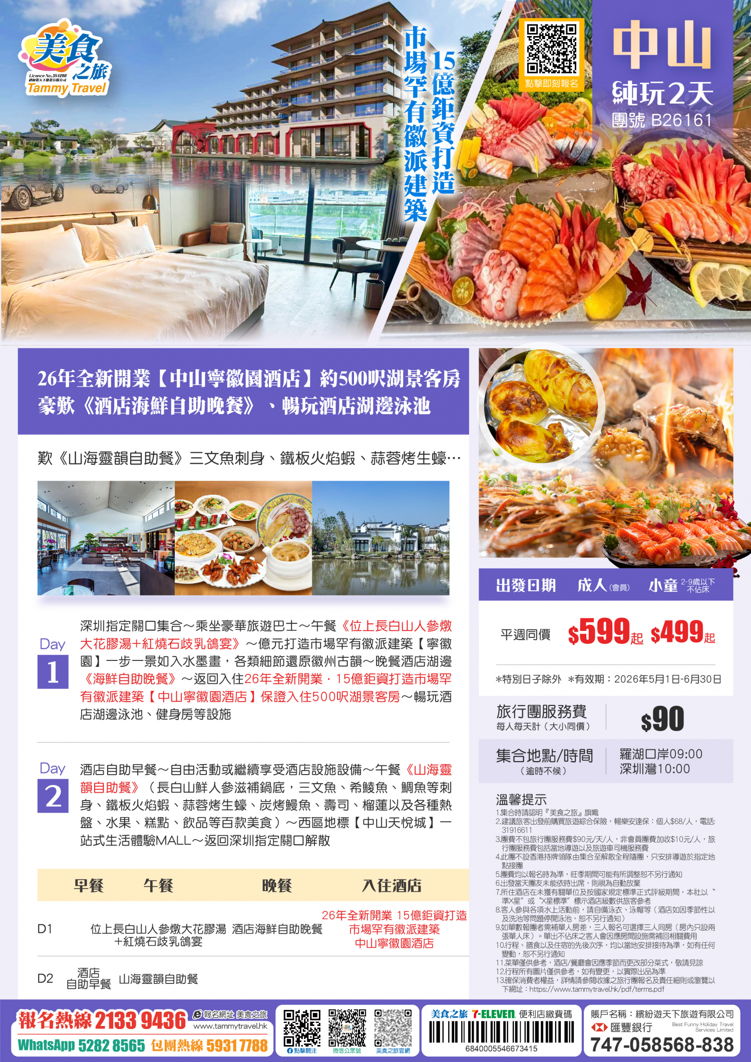26年4月全新開業·15億鉅資打造市場罕有徽派建築【中山寧徽園酒店】 保證入住酒店500呎湖景客房、暢玩室外湖邊泳池、歎《山海靈韻自助餐》三文魚刺身、烤鰻魚、鐵板火焰蝦、蒜蓉烤生蠔…… 純玩2天
