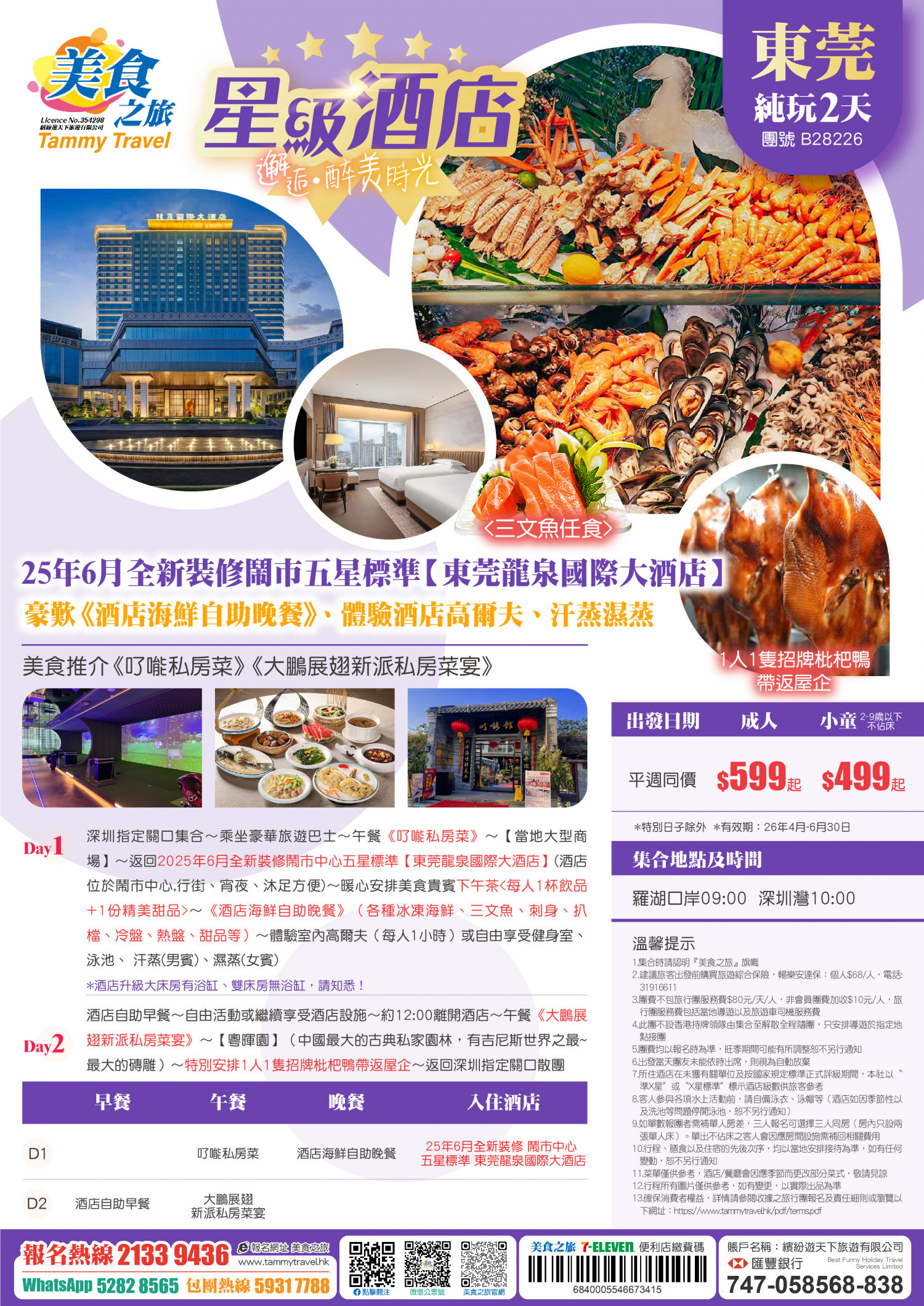 25年6月全新裝修鬧市五星標準【東莞龍泉國際大酒店】歎酒店海鮮自助晚餐、體驗酒店室內高爾夫+汗蒸濕蒸、美食推介《了能私房菜》《大鵬展翅新派私房菜宴》純玩2天
